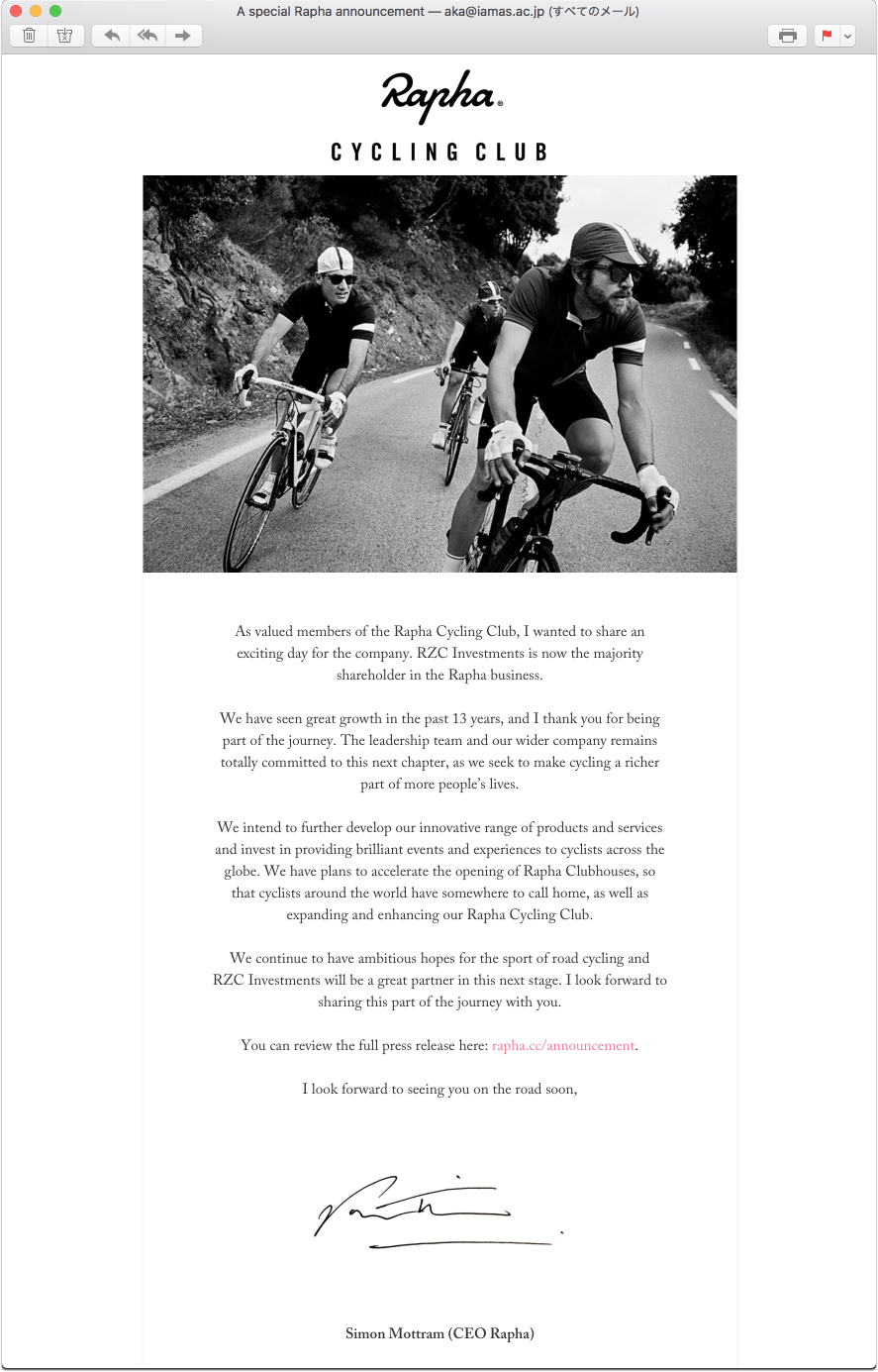 8月8日の未明、ふと目が覚めてチェックすると、サイモン・モットラム(Simon Mottram)氏からの「A special Rapha announcement」なるメールが届いていた。同氏はサイクリングに特化したアパレル・ブランドRaphaの創立者であり、CEO(最高経営責任者)。何度か会ったことはあるが、直接メールをもらうほどの仲ではない。何事かと思いながら、メールを開いてみた。