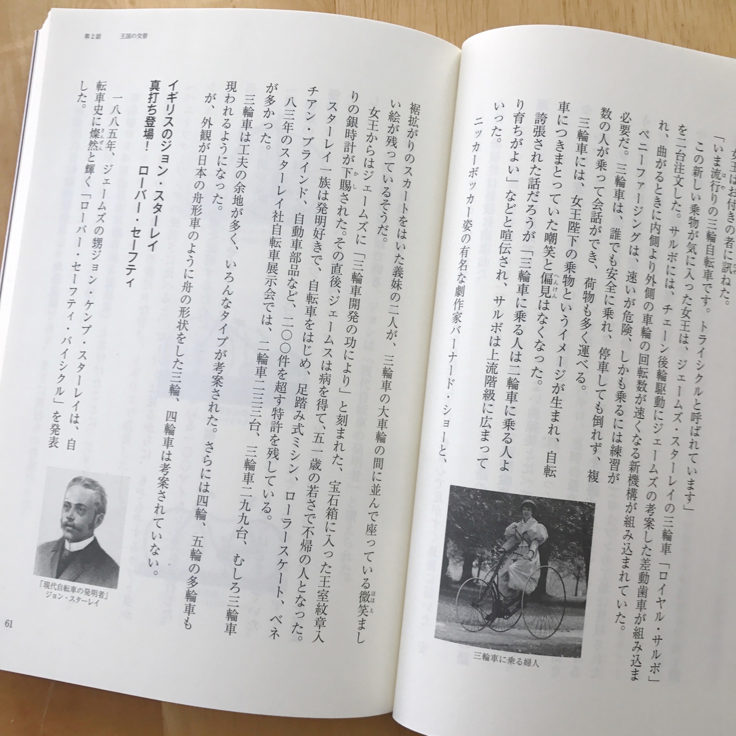 続く第2章では、一般的には世界最初の自転車と言われるドライジーネに始まり、ミショー型やオーディナリー型を経て、セーフティ型として今日の姿を得るまでが語られる。ここでも、ドライス男爵は、なぜドライジーネを考案したのか?といったエピソードも楽しい。第3章はタイヤの発明や、大量生産としてイギリスやアメリカで自転車産業が本格化する過程が描かれる。