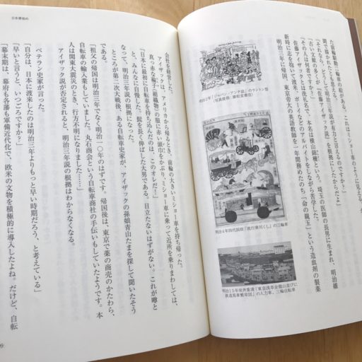 第4章で日本に戻り、幕末もしくは明治初期に欧米の自転車渡来期からだ。明確な文献が残っていないので、一種の謎解きとなる。また、日本独自の発明である人力車への言及や、からくり儀右衛門らの国産自転車の考察も興味深い。第5章では、競走会やクラブを通して明治期の自転車の受容を探り、三浦環や小杉天外の通俗的側面から夏目漱石や志賀直哉の文学的側面も紹介される。