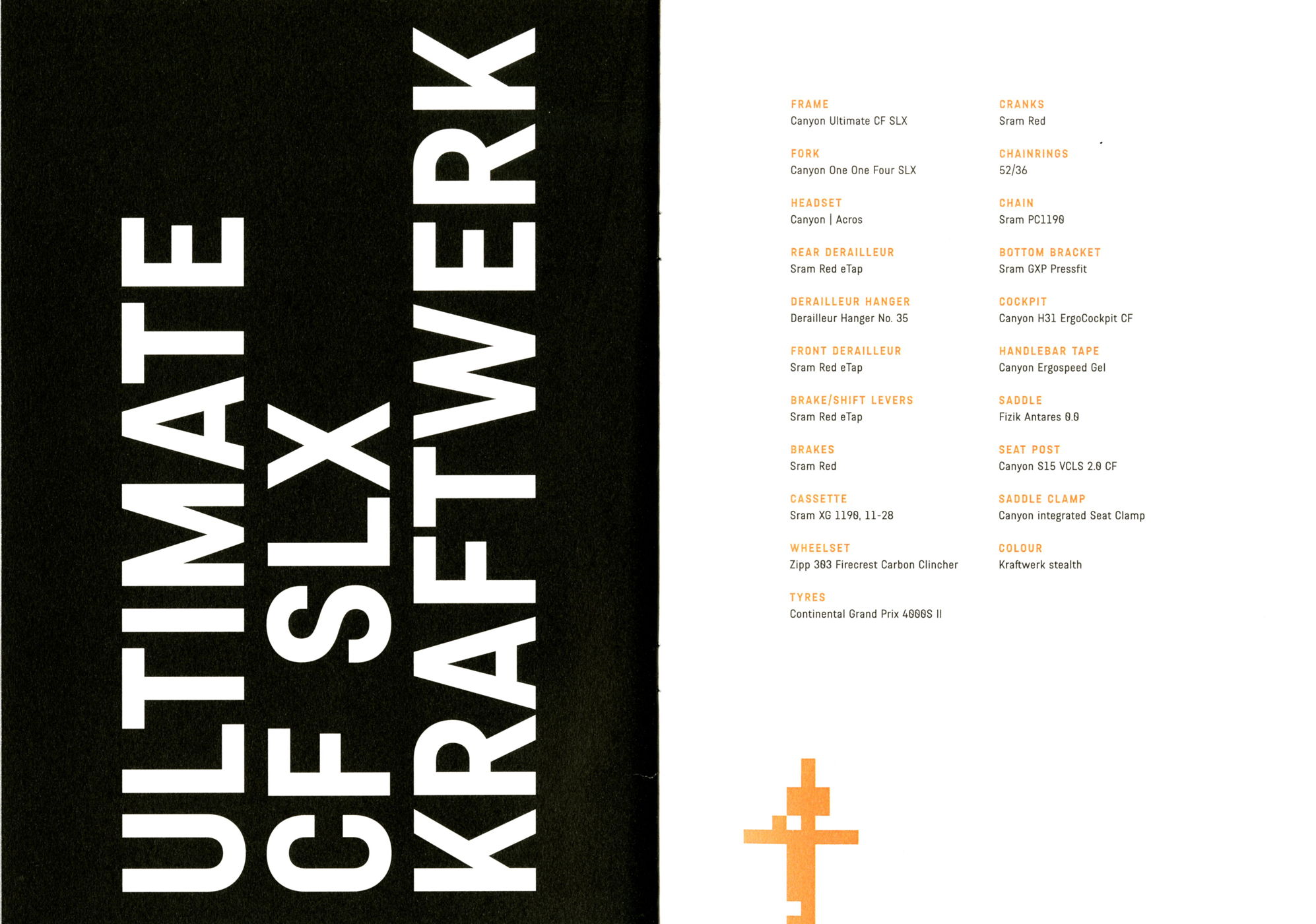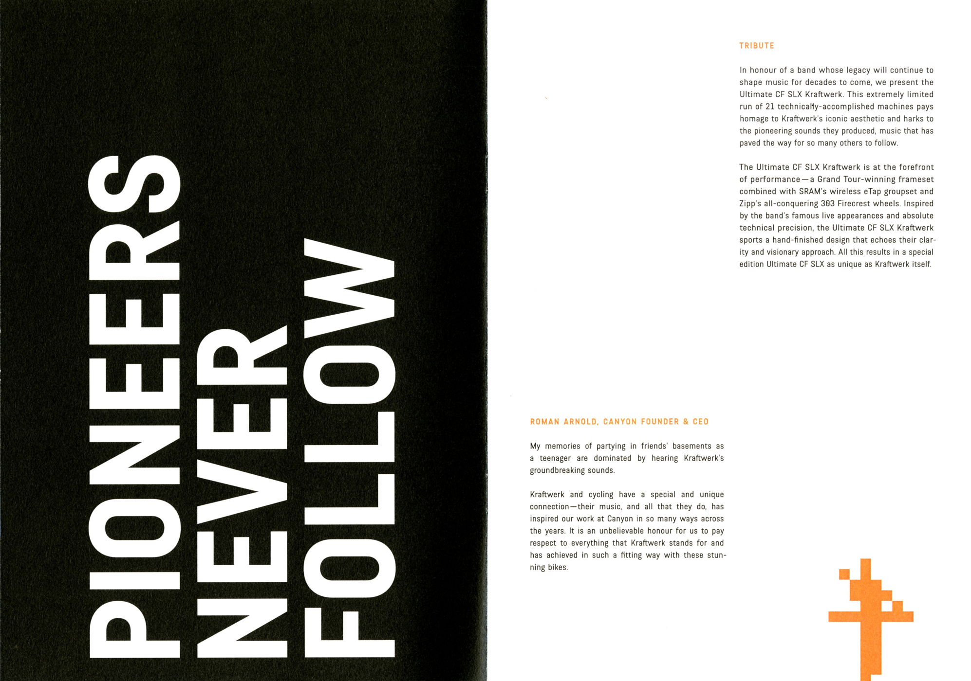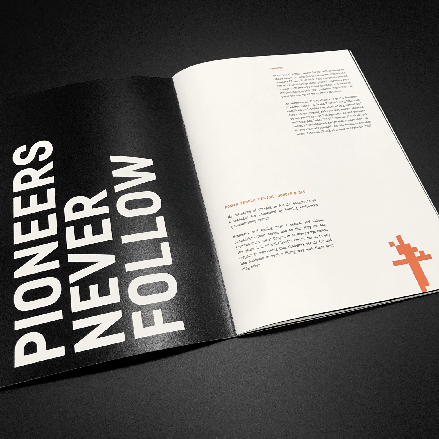 キャニオンとクラフトワークによる特別仕様ロード・バイクUltimate CF SLX Kraftwerkに付属するスペシャル・ギフト、早い話がオマケは、ブックレット、シール、マイヨ・ジョーヌ(黄色いジャージ)だった。これらのうち、今回はブックレットを紹介する。これは幅17cm、高さ24cm、B5判より一回り小さいサイズで、32ページの中綴じ製本された小冊子だ。