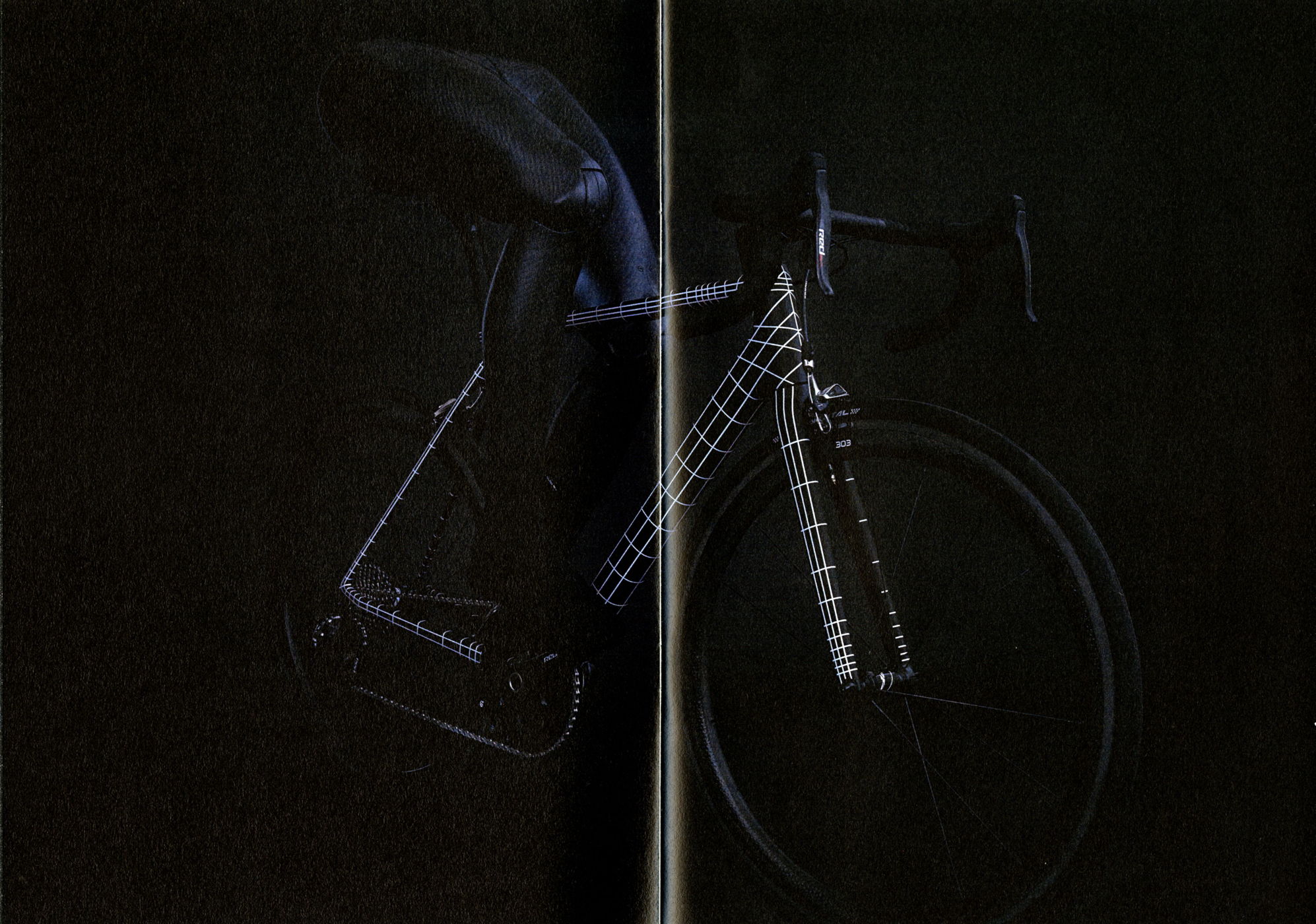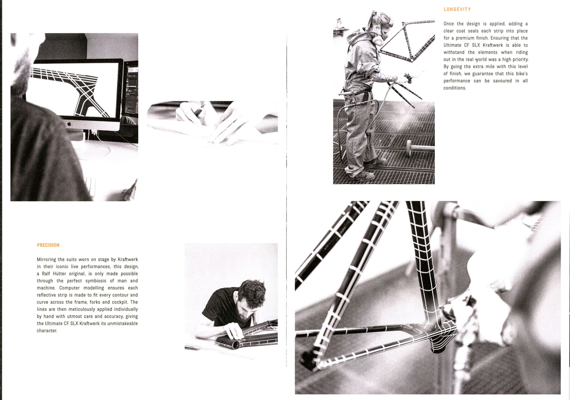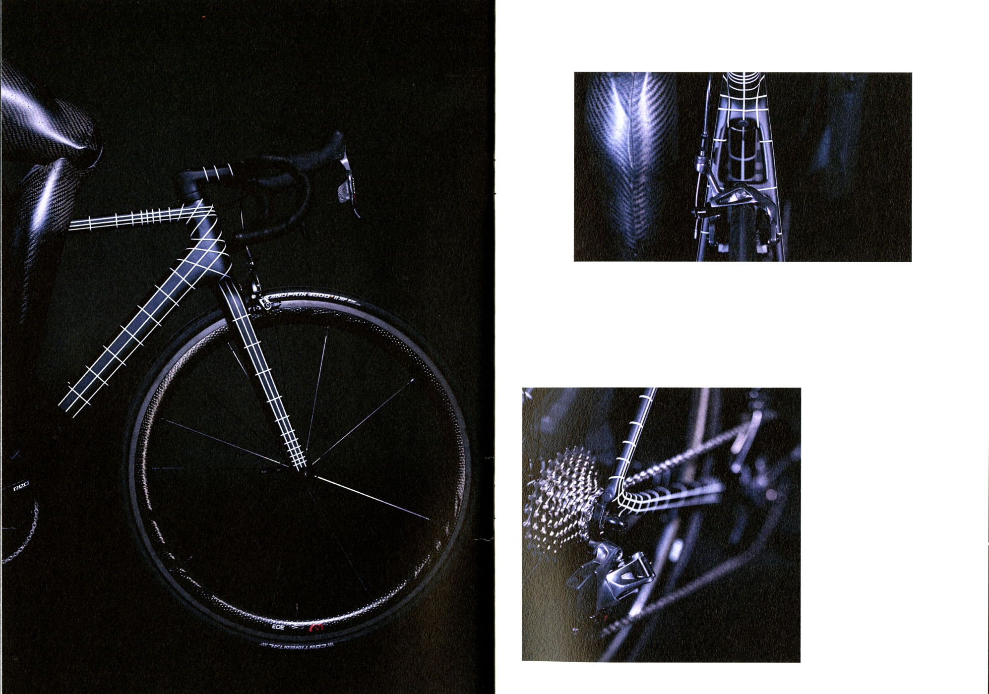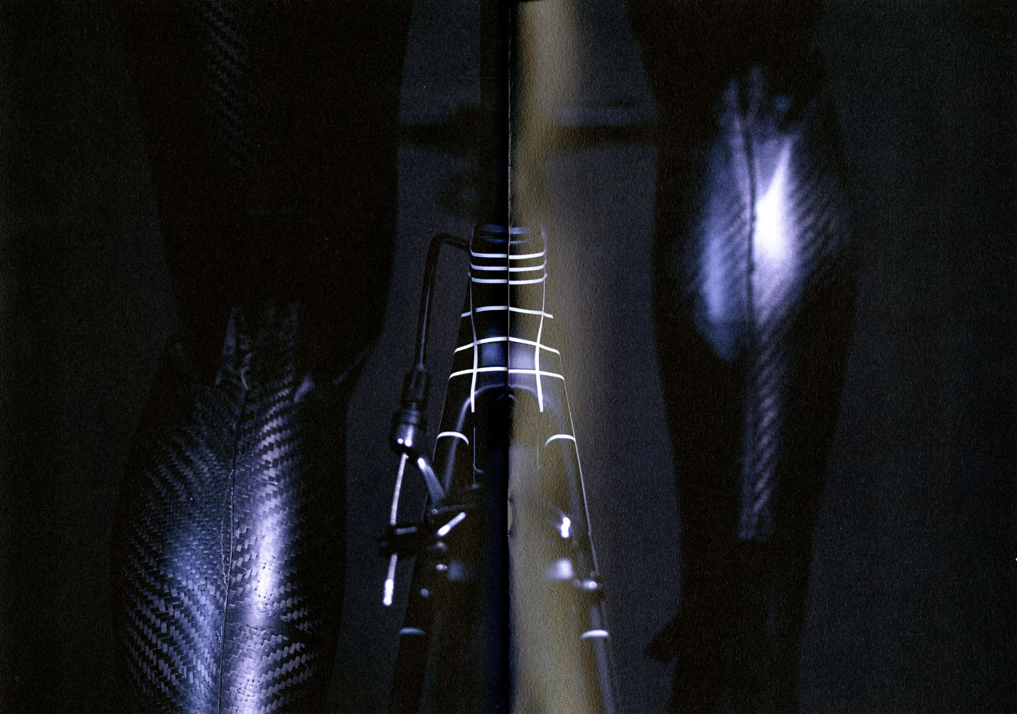 本文の構成は緩急取り混ぜてテンポ良く進む。見開きの大きな文字は、クラフトワークの代表曲「ツール・ド・フランス」の歌詞。クラフトワーク自身は、ワイヤーフレーム模様の衣装を纏ったステージ写真として登場する。そして、本作の自転車の写真が数葉あり、カーボン模様の下半身人形が跨っている。これもクラフトワークっぽい。この自転車に乗るべきは、人間ではなくロボットかもしれない。