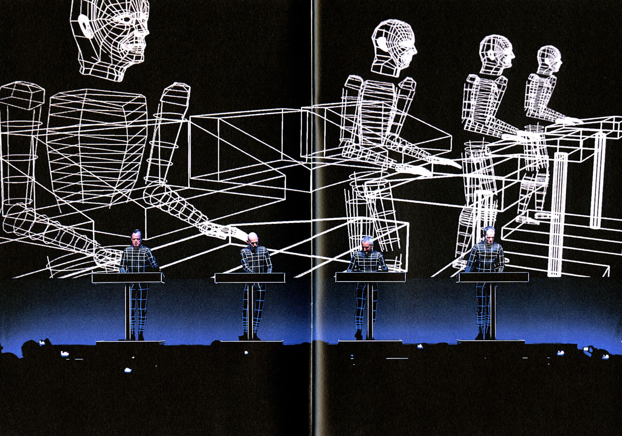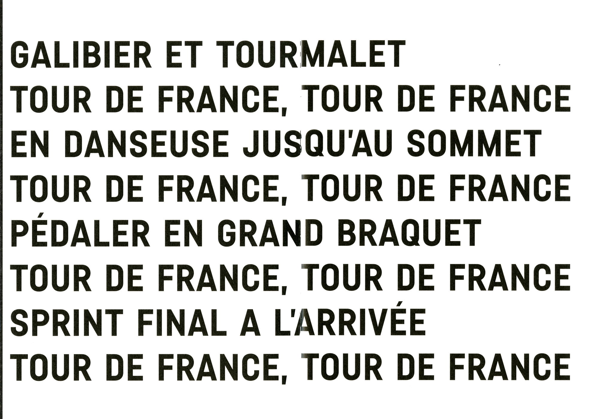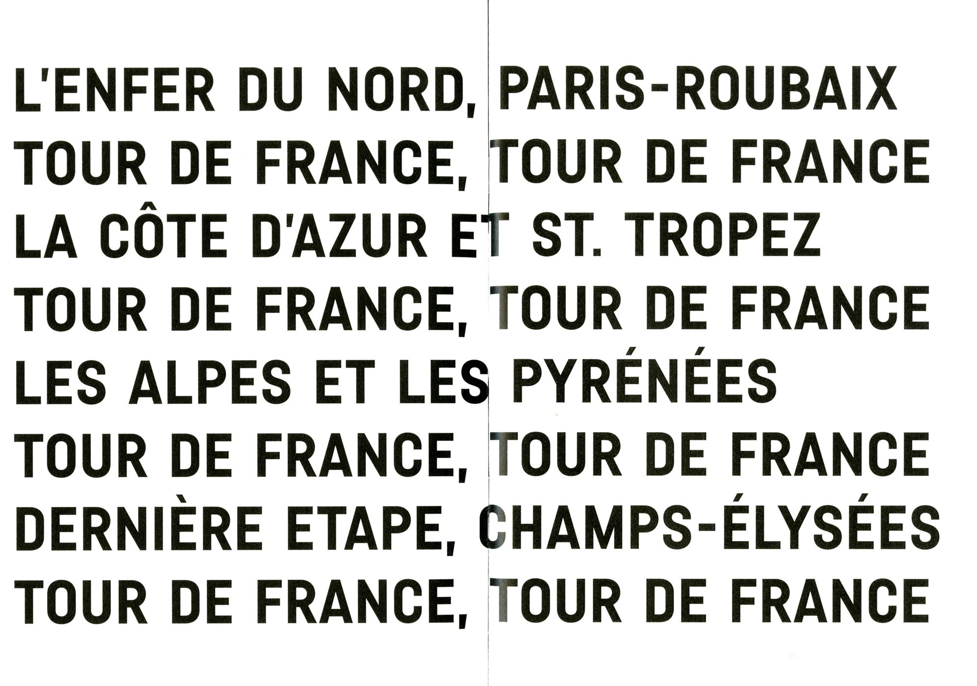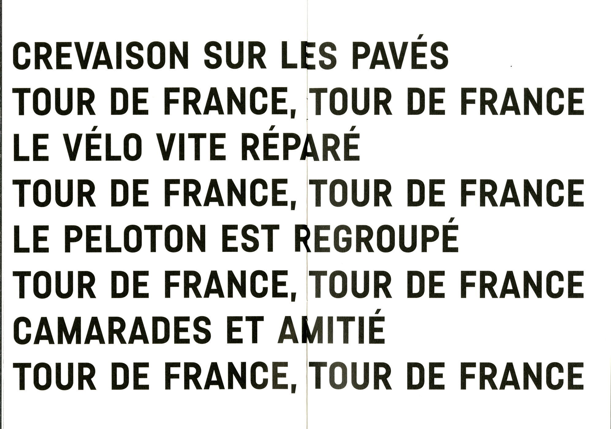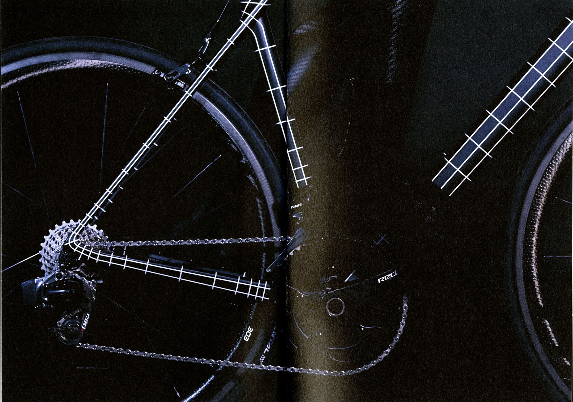 本文の構成は緩急取り混ぜてテンポ良く進む。見開きの大きな文字は、クラフトワークの代表曲「ツール・ド・フランス」の歌詞。クラフトワーク自身は、ワイヤーフレーム模様の衣装を纏ったステージ写真として登場する。そして、本作の自転車の写真が数葉あり、カーボン模様の下半身人形が跨っている。これもクラフトワークっぽい。この自転車に乗るべきは、人間ではなくロボットかもしれない。