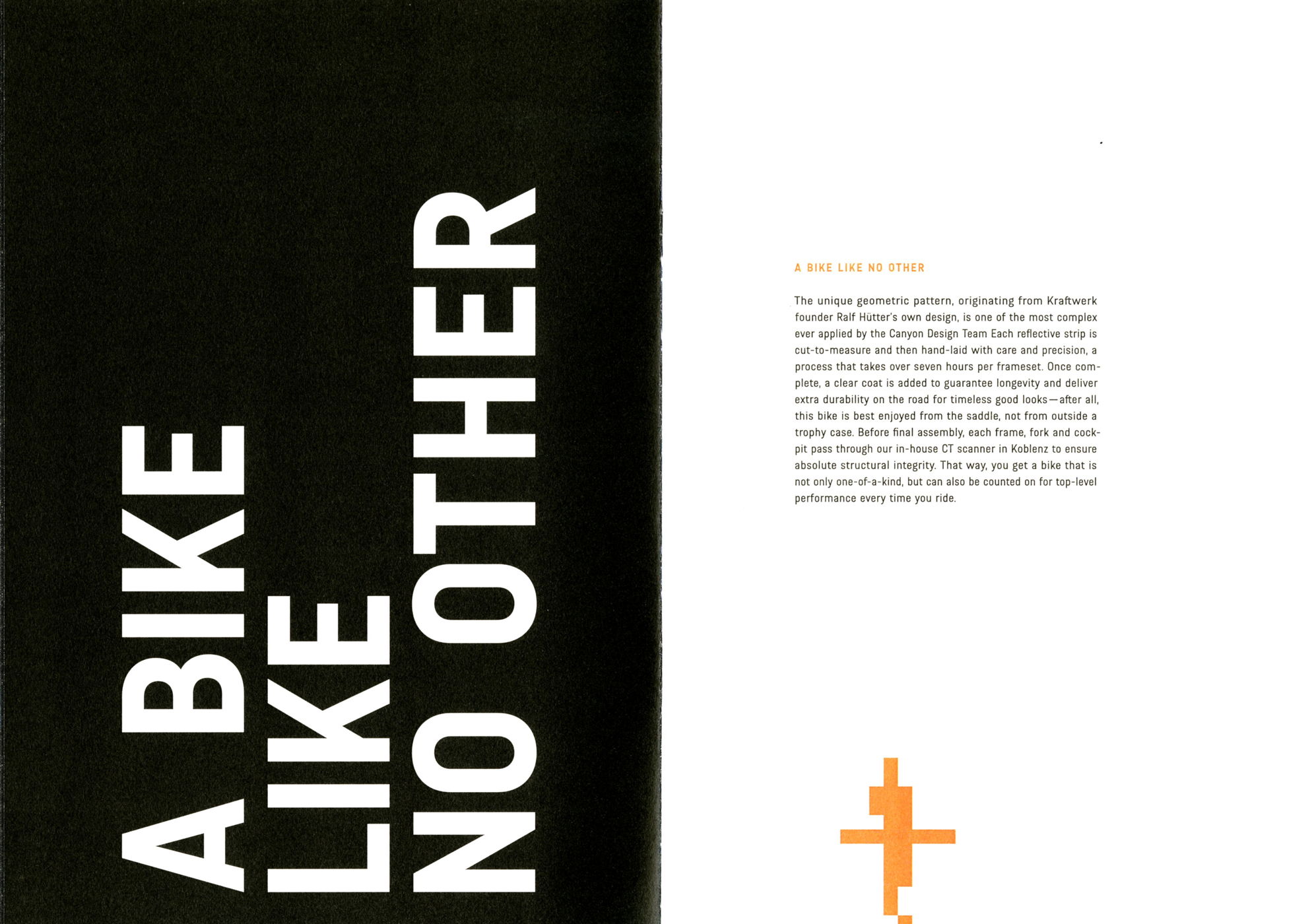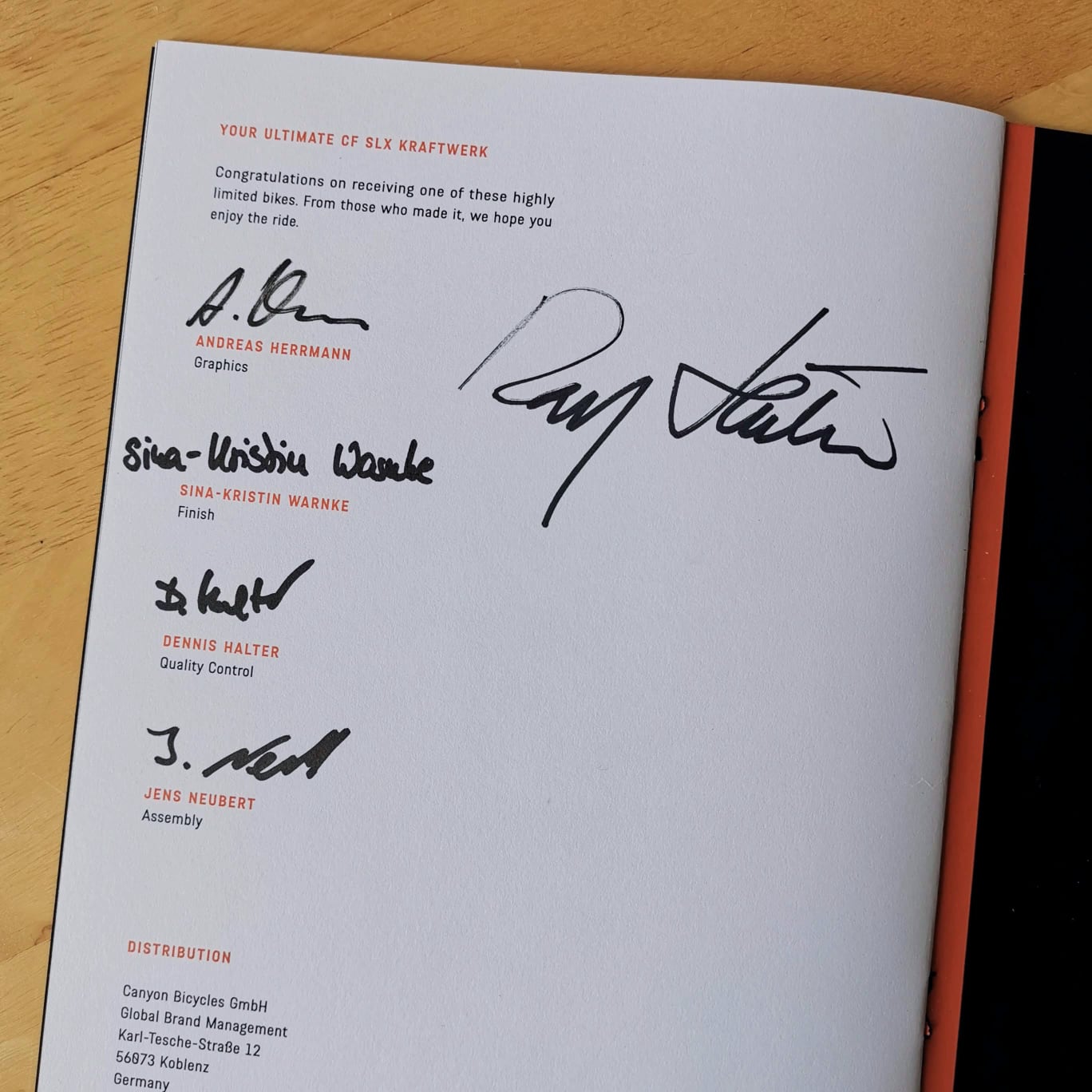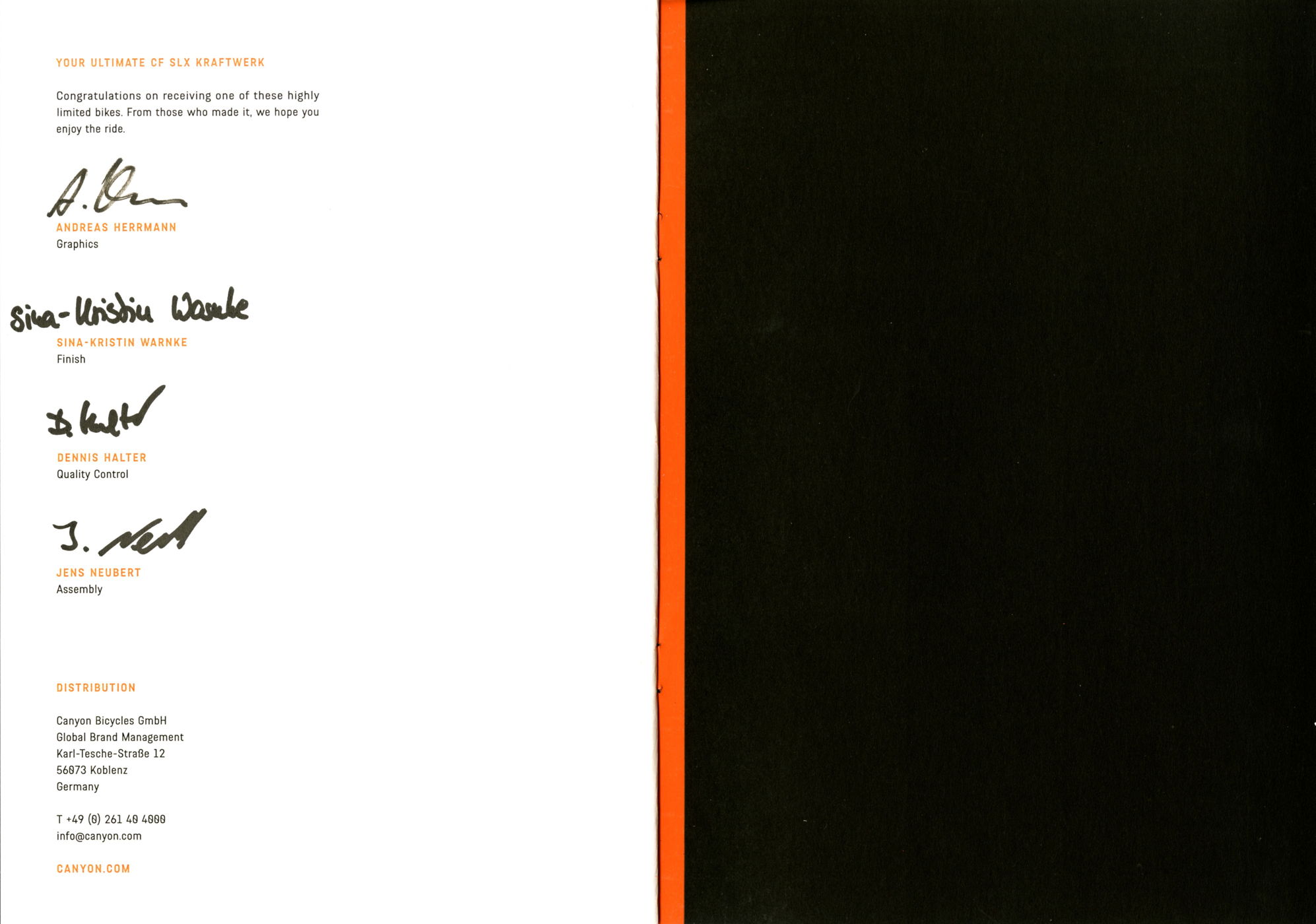 テキストでは、キャニオンの創設者にしてCEOのRoman Arnold氏の巻頭言に続いて、この自転車の意義と特徴が語られる。そして、自転車のデザイン、耐久性、品質管理、組み立てが、高品質であることが簡潔に述べられる。さらに、自転車を構成するパーツのリストがあり、最後に製造担当者の自筆サインで締めくくられる。質実なドイツ人のクラフトマンシップが伝わってくるようだ。