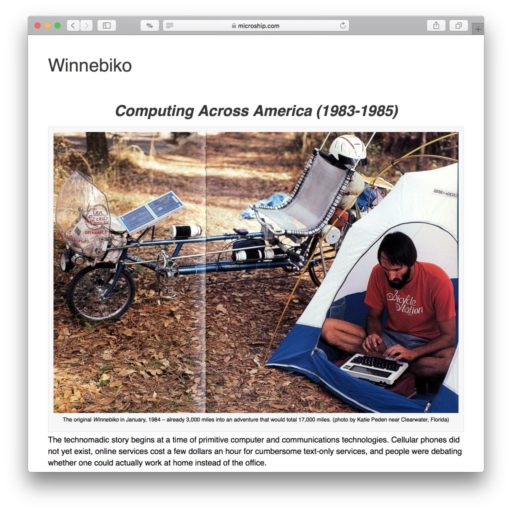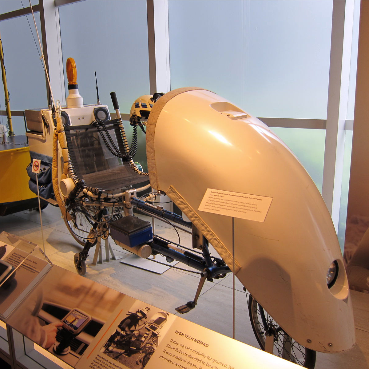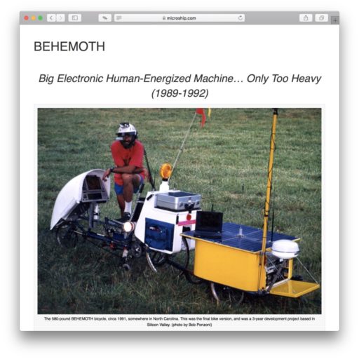 これはハイテク・ノマドを謳うSteven K. Roberts氏によるBEHEMOTH (Big Electronic Human-Energized Machine, Only Too Heavy、1989)。当時のコンピュータとワイヤレス通信が組み込まれ、ソラーパネルを備えたトレーラーを牽引して、総重量は580ポンド(263kg)に達する。このような歴代3台の自転車で17,000マイル(2,735km)にも及ぶ旅をしながら、文章を書いては出版社に送信していたらしい。