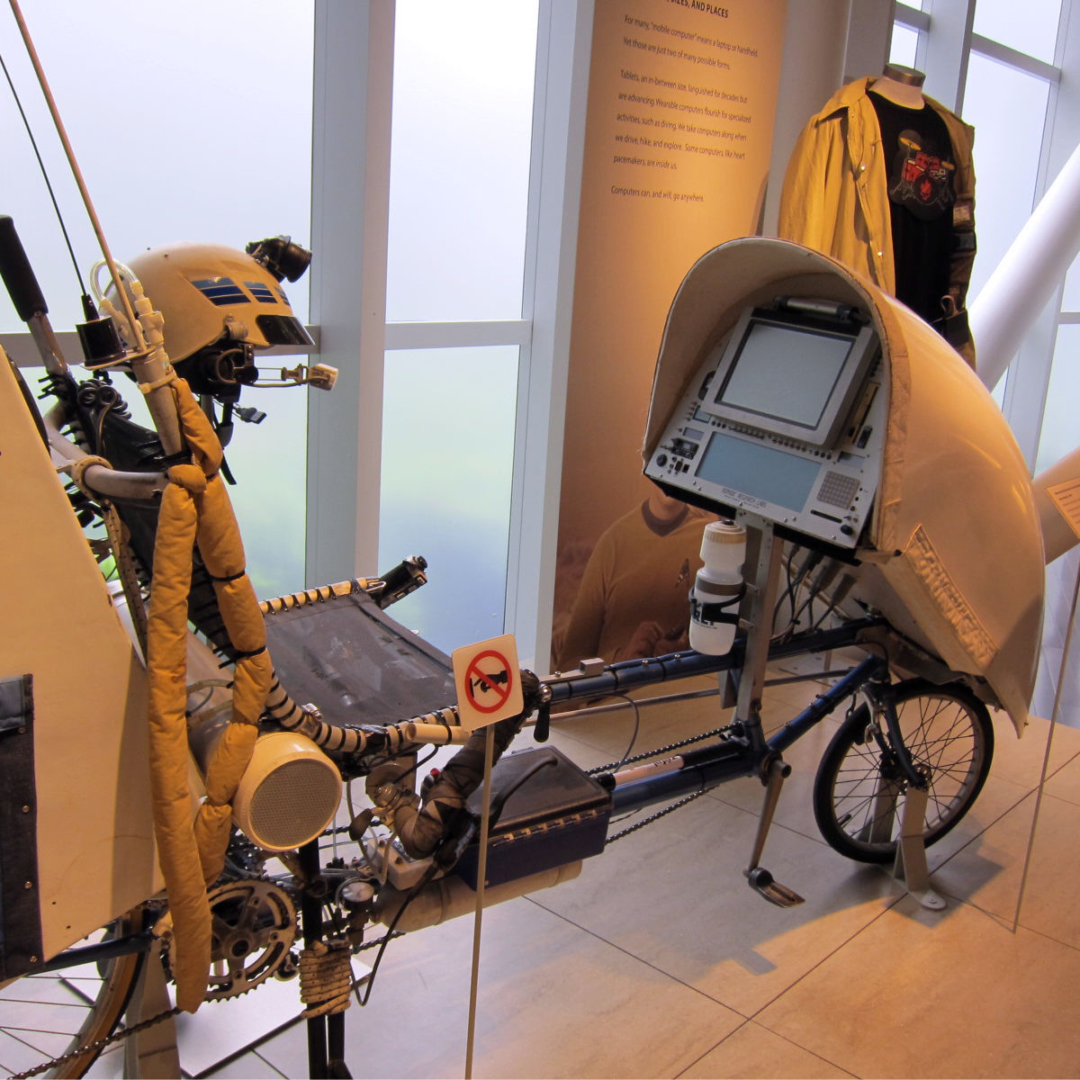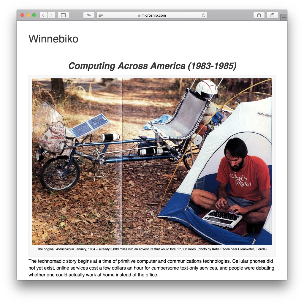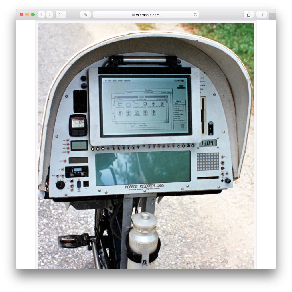 同氏のNomadic Research Labsサイトによれば、最初に作られたWinnebiko(1983)はソラーパネル程度だが、続くWinnebiko II(1986)では前輪部にトグル・スイッチやプッシュ・ボタンを満載したコンソールが備わる。そしてBEHEMOTH(1989)はMacintoshと液晶ディスプレイを搭載。Macintosh Portable(1989)と同時期だから恐れ入る。