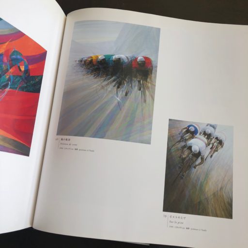 ところが、画集の終盤になって驚くべき絵画が掲載される。「風の集団」と「ピストの上で」では、大接戦を演じるロードレースの選手たちが描かれているのだ。具象画に近いが、それまで抽象絵画を彷彿させる要素が見え隠れする。しかも、そのモーフィング途中を示す「スプリント」なる親切極まりない作品まである。気晴らしに描いた風景画にも細身の美しいロードバイクが描かれている。