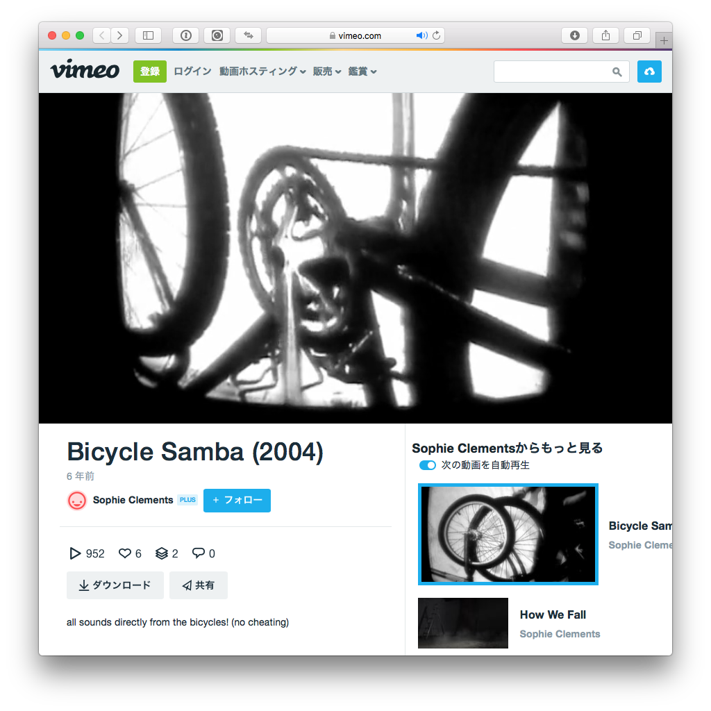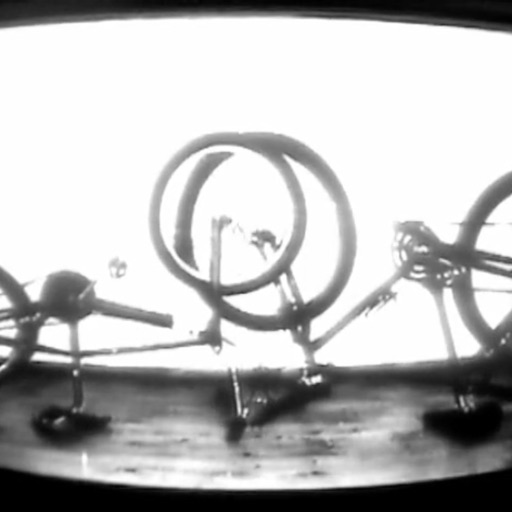 ロンドン在住のビジュアル・アーティスト、ソフィー・クレメンツ(Sophie Clements)は、科学や実験音楽からインスピレーションを得た映像やインスタレーションを数多く制作している。そんな彼女が、サウンド・アーティスト、ジョン・ヘンディコット(John Hendicott)とともに、自転車を題材に作ったのが「Bicycle Samba」、自転車のサンバだ。古めかしい白黒のブラウン管風映像だが、2004年の作品。