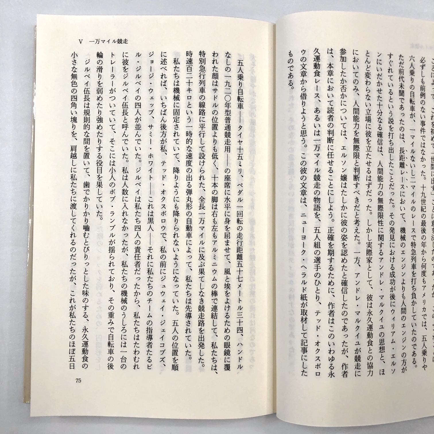「超男性」は、さらに情愛と機械に話が進む。その前振りが自転車と機関車のレースだが、眩惑するような物語の本質は同じだ。すなわち、運動において肉体と機械を同一化し、精神を超克する超人願望だ。従って、最も機械化された運動である自転車は必然であったわけだ。イタリア未来派は自動車を礼賛したが、それよりも数年早く、ジャリは幻影のうちに人間を自転車に託した。