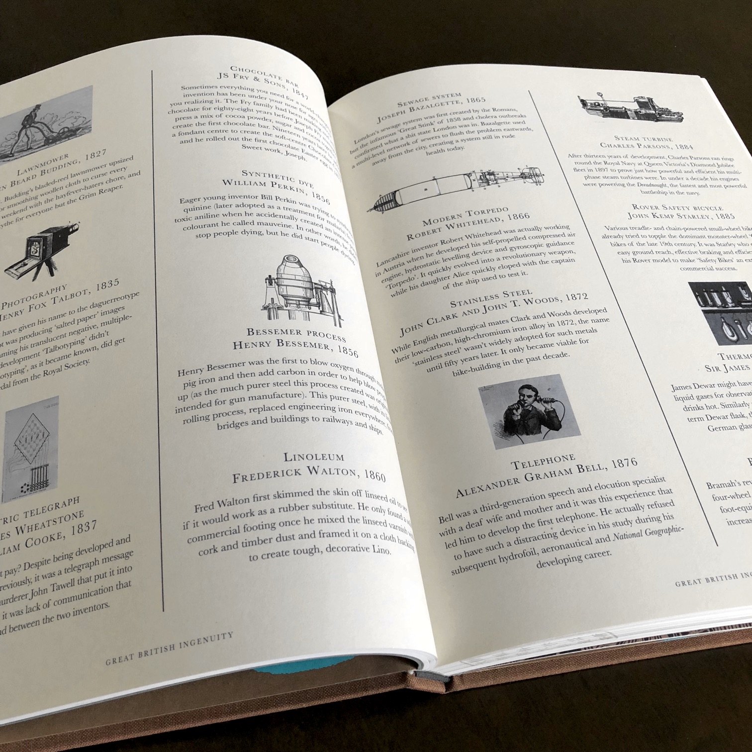 別の視点からは、大英帝国発明品が紹介される。例えば、歯ブラシ(1770)や缶詰(1810)、電話(1876)などとともに、もちろん革サドル(1878)がある。自転車関連の美術品としては英国ではないが、デュシャンの車輪(1913)やピカソの雄牛(1942)に続いて、しっかりザノッタのセラ・スツール(1957)が登場する。他にも嫌味すれすれのブリティッシュ・ジョークが随所に紛れ込んでいる。
