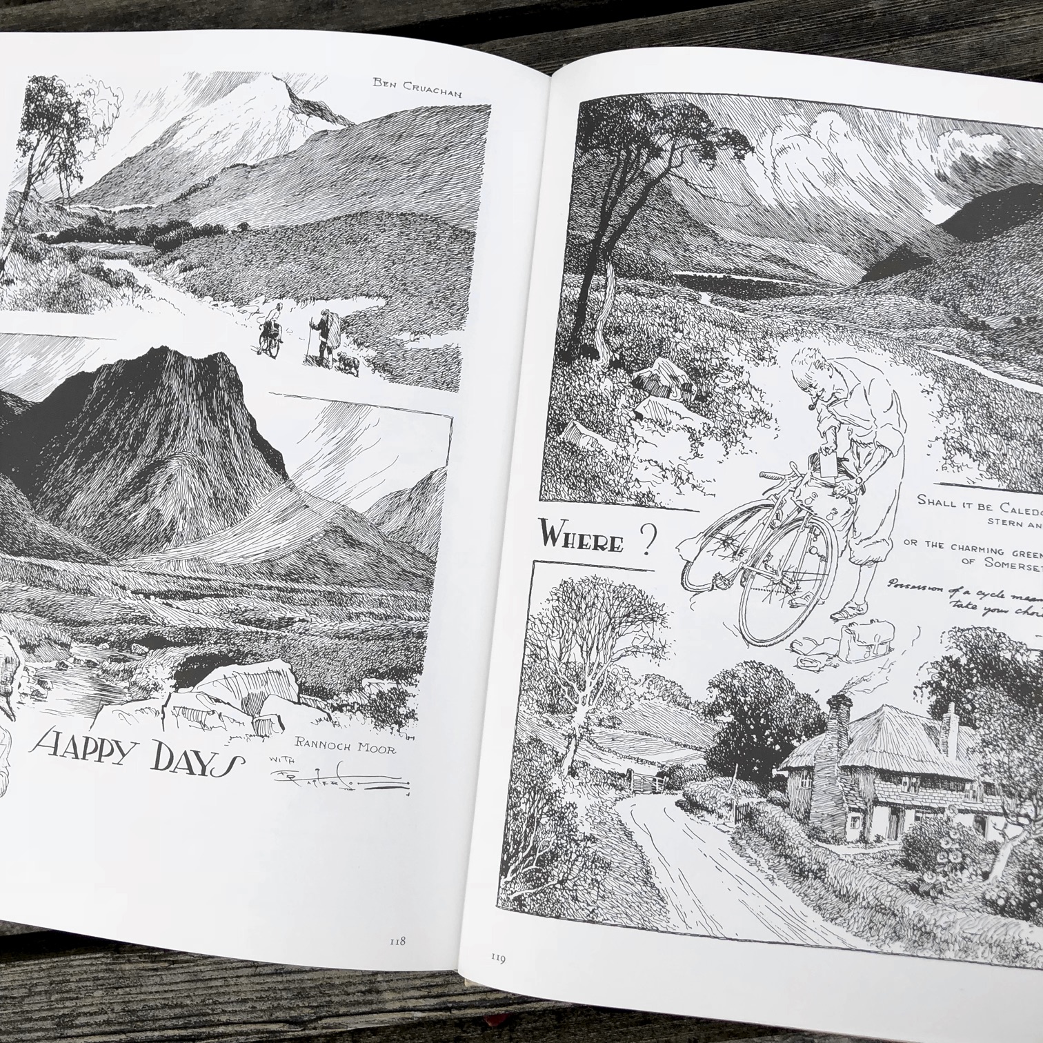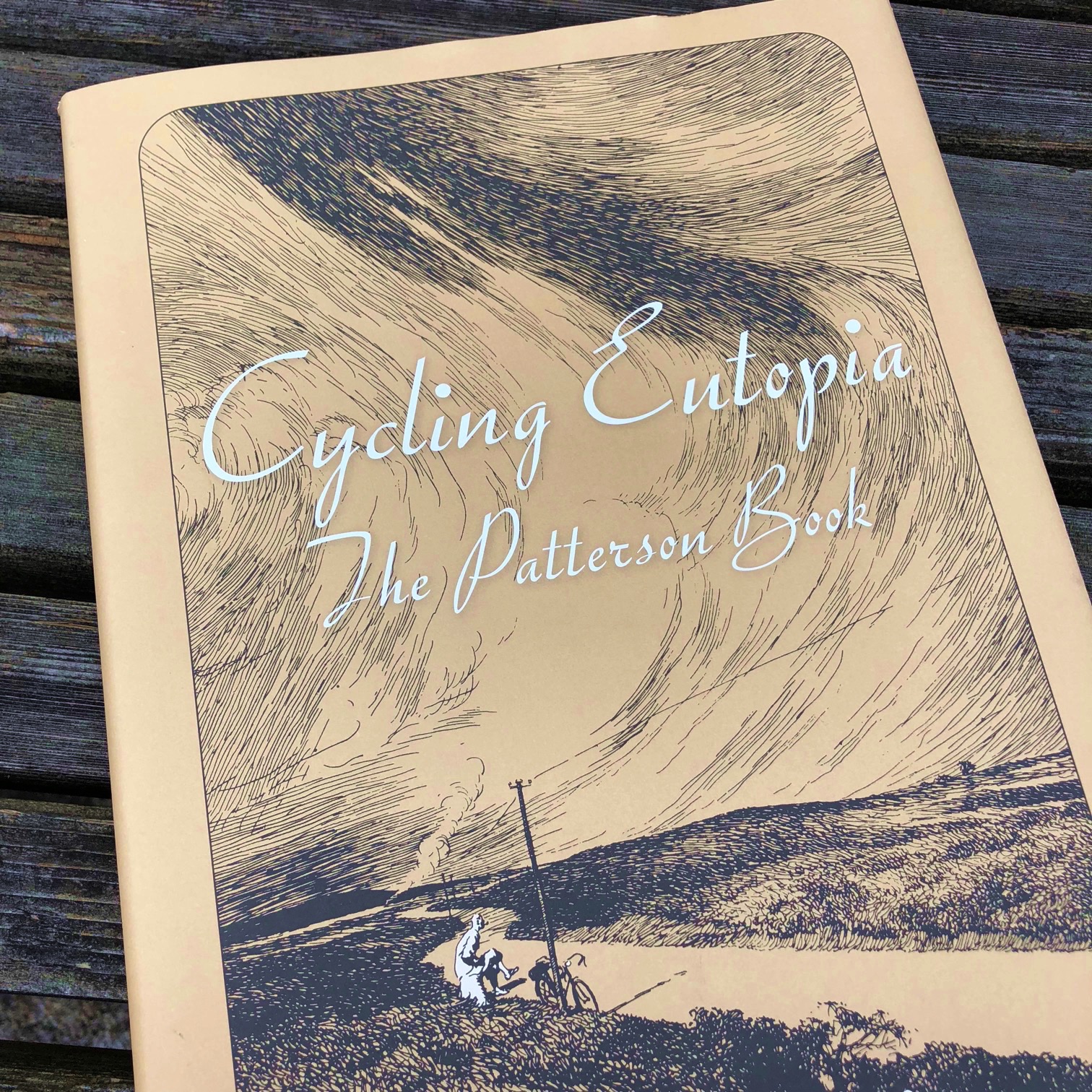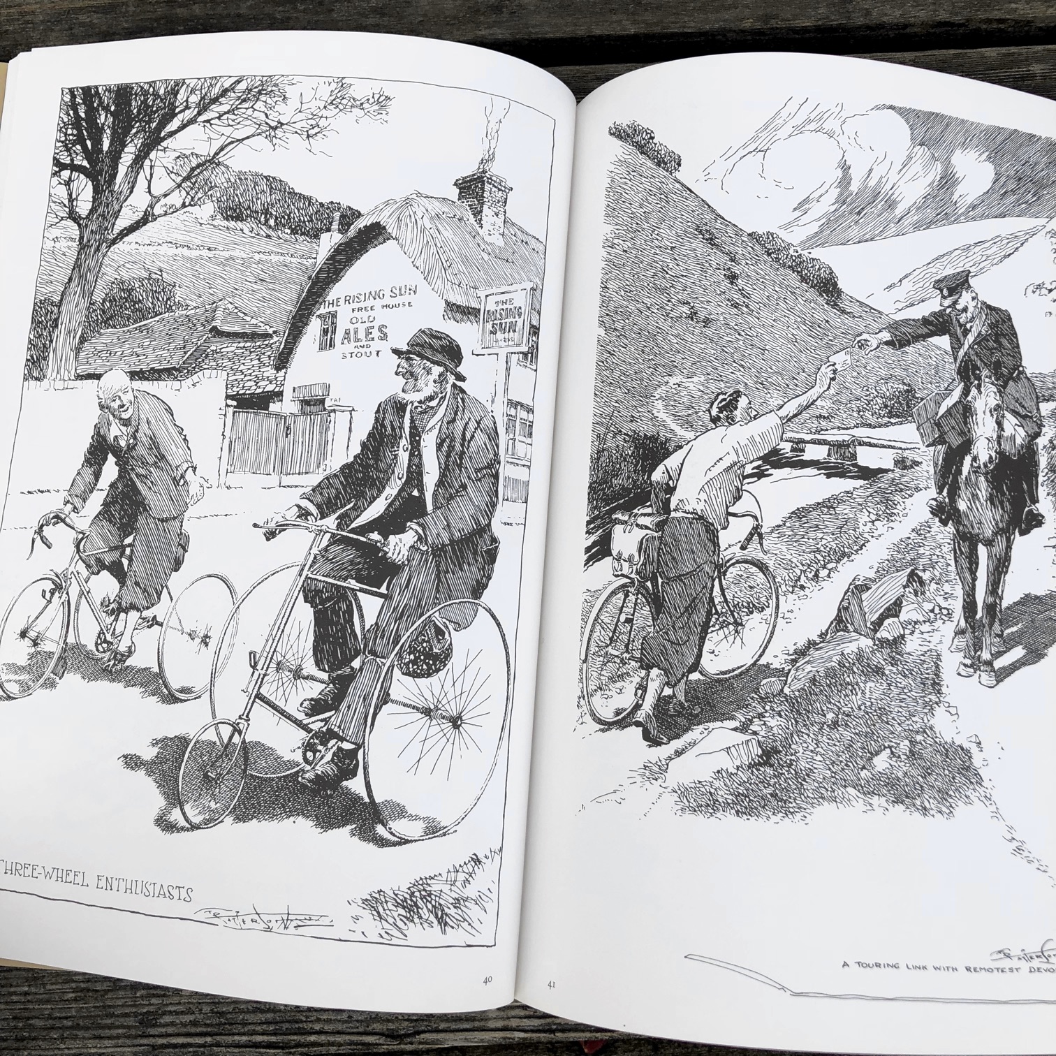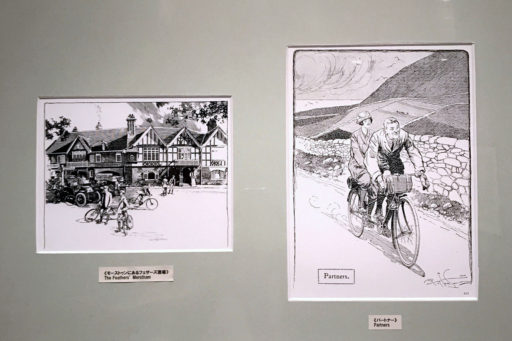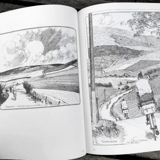 「サイクリング・ユートピア」は、フランク・パターソン(Frank Patterson)が描いたサイクリングを題材とするペン画集だ。そこには19世紀末から20世紀半ばにかけてのイギリスの田園地帯が広がり、美しい牧草地やのどかな田舎町を背景に、自転車による行動と生活が活き活きと描かれている。戦災で多くの原画が消失したそうで、雑誌などの印刷物から100枚以上の作品を収録している。