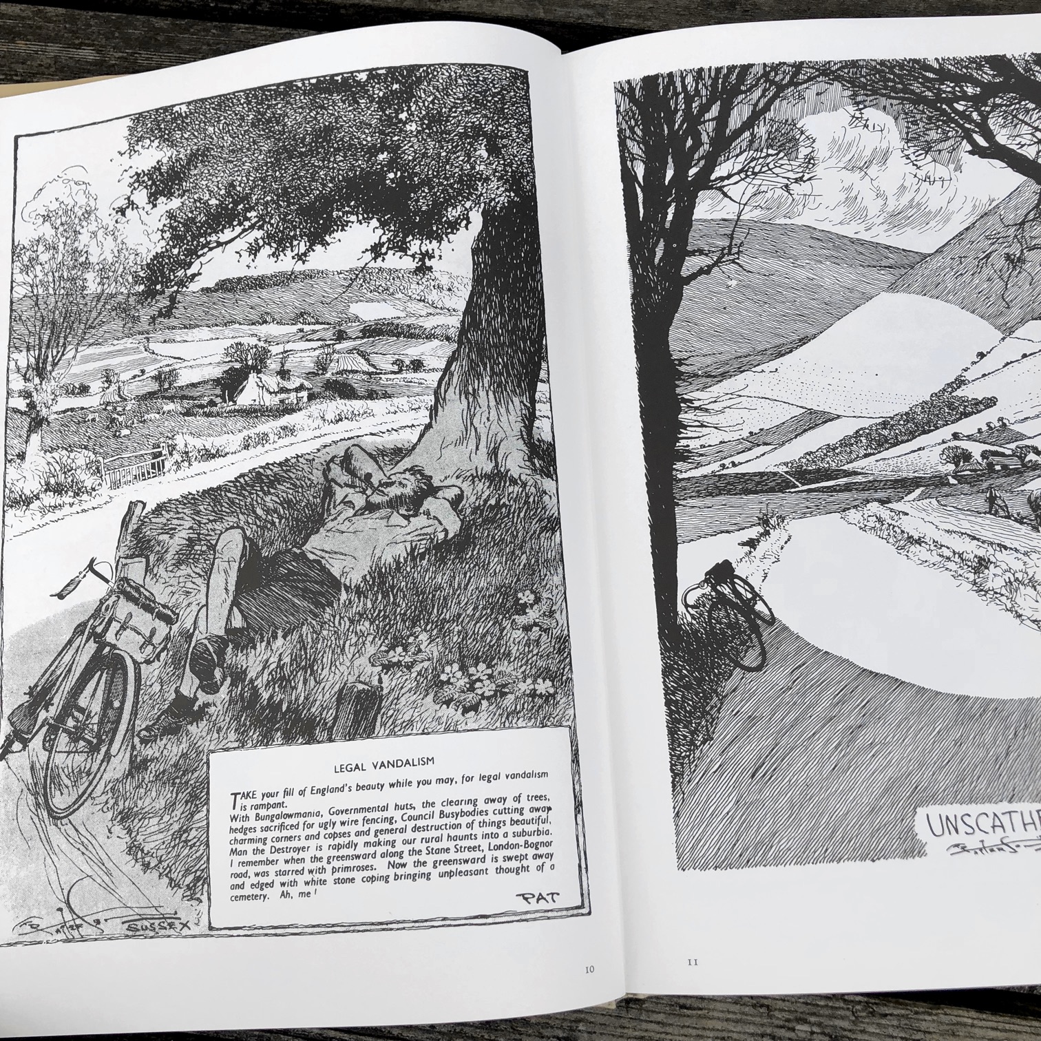 筆者は以前にブライトンやオックスフォードの郊外を走ったことがある。僅かな経験ながら、それでも描かれた風景が記憶に呼応する。自然災害が少ないので、地形や建造物の変化も少ないのだろう。麗しい半自然とも言える丘陵地帯は豊かで慎み深い。一方で、Legal Vandalism(合法的破壊)と記して環境問題を憂う絵もある。この100年前の警鐘は未だに解決されていない。