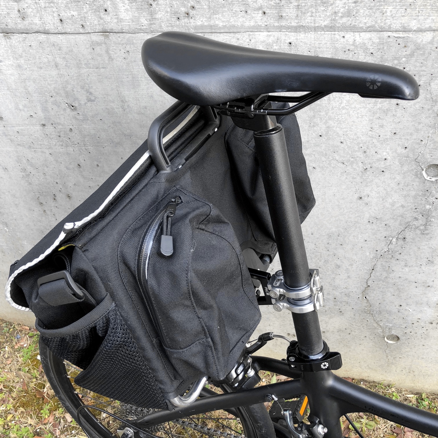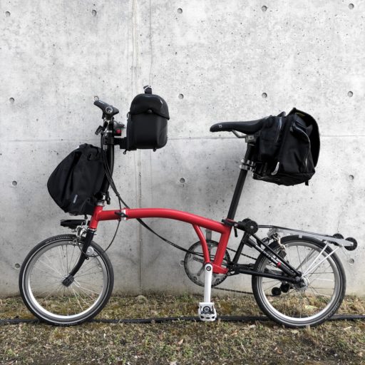 このようにして、ユニバーサル・キャリア・システムは呆気ないまでに簡単になった。用もないのに、いろいろな自転車に取り付けたくなる。ただ、ハンドル・ポストに取り付けた場合は、荷物が重くなるとハンドルが取られる。そこで、シート・ポストに取り付けてリア・キャリア・システムとするのがお薦め。さらに、やや窮屈ながら、Bromptonなら圧巻の3個のバッグ取り付けも可能だ。