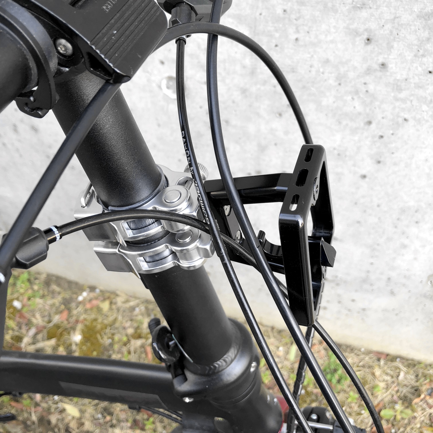 そこで、より簡単な手法を求めて、AmazonやWiggle、そしてモノタロウやAliExpressを彷徨う日々が続いた。探索の末に見つけたのがMINOURAのスペースマウント(2穴)。これはBromptonのヘッドチューブのネジ穴にそっくり(写真は合成)。ネジのサイズもM5とピッタリ。しかし、2つのネジ穴の間隔は15mmと明らかに短い。ハンドル・ポスト等に取り付けると、ネジ穴が横に並ぶのも都合が悪い。