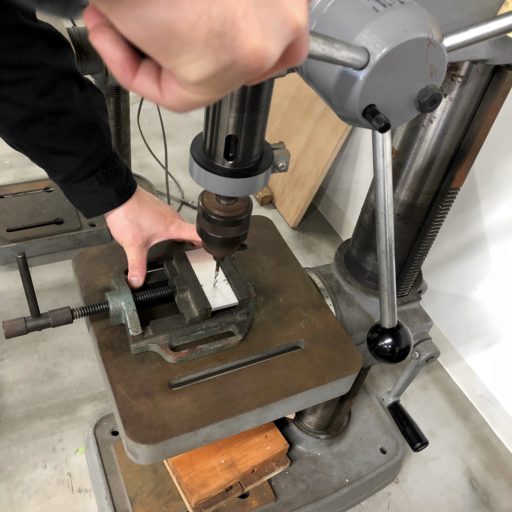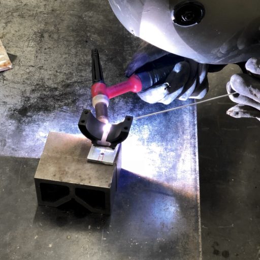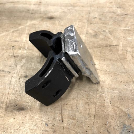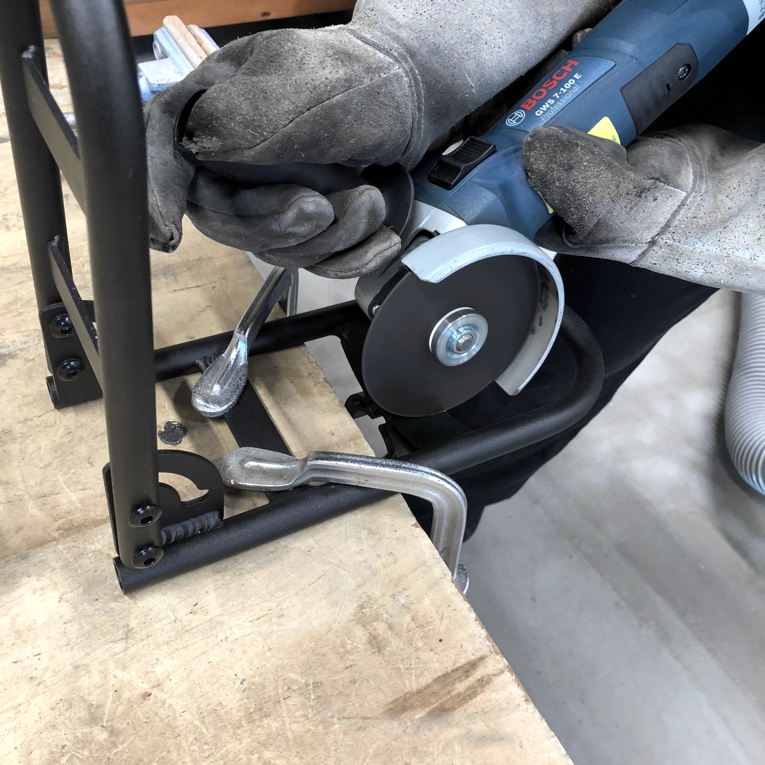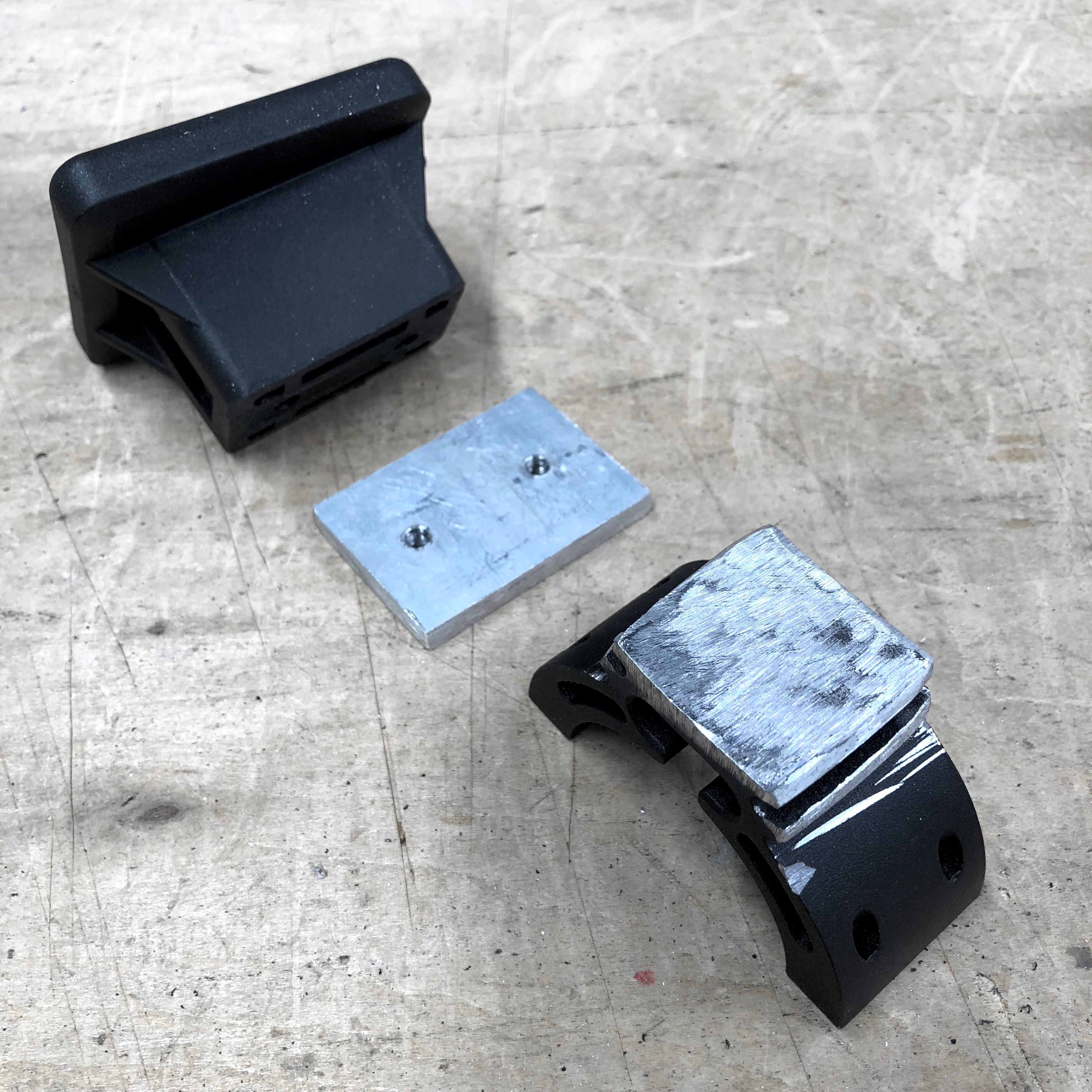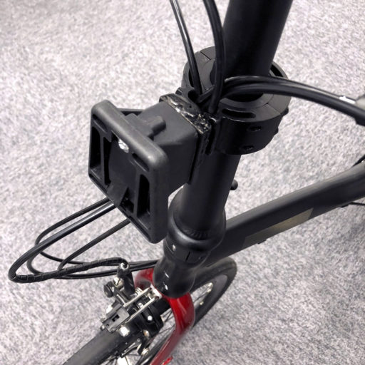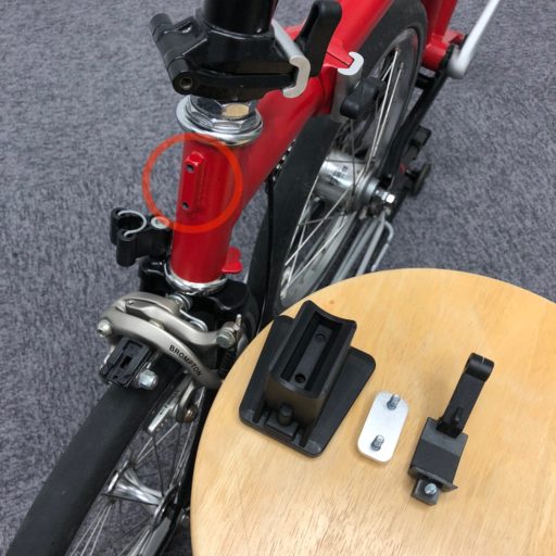 Bromptonのフレーム先頭にはフロント・キャリア・ブロックがあり、これによって専用バックを固定する。この黒いブロックはヘッド・チューブに開けられた2つのネジ穴にネジ留めされている。つまり、他の自転車でも同等のネジ穴を開ける必要がある。そこで、ネジ穴を開けた細長い金属片をフレームに溶接する先例があった。これはBromptonのヘッドチューブ突起部の形状を再現している。