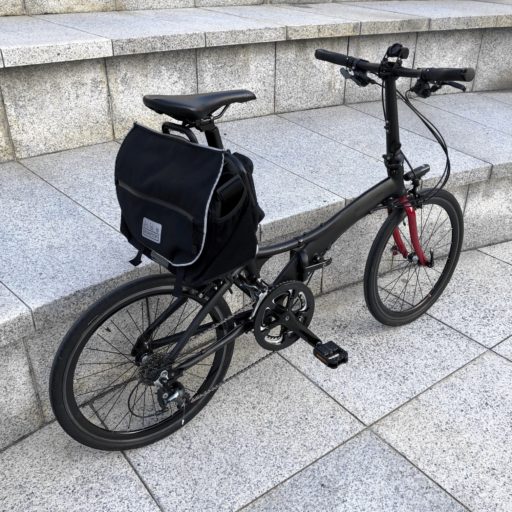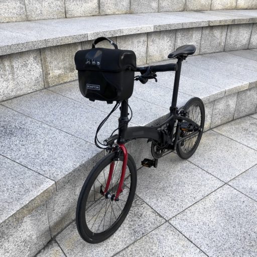 クラシカルで可愛らしい外観のBromptonは、優れた折り畳み小径車で、随所に施された設計の巧みさに感心する。その最たる例が専用バッグで、これがあってこそBromptonが完成すると言っても良いほど。専用バッグは十数種類あり、用途や気分に合わせて取り変えるのも楽しい。このようなバッグを他の自転車にも取り付けたくなるが、しかし、これは簡単ではない。