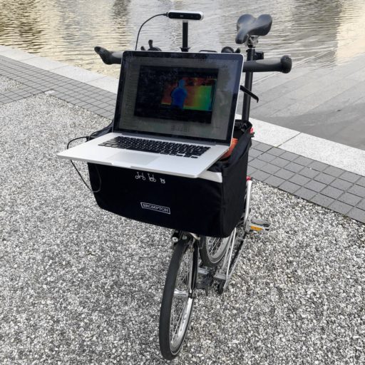 Intelが開発、販売しているRealSenseは、深度(奥行き)が計測できる小型カメラ。本体から投射する赤外線のパターンを2つの赤外線カメラで読み取って、その差異から距離を測定する。その最新版であるD400シリーズは、一昔前のKinectに比べて大幅に小型化されており、性能も向上している。そこで、これを自転車に取り付け、深度情報を記録しながら街をライドした。