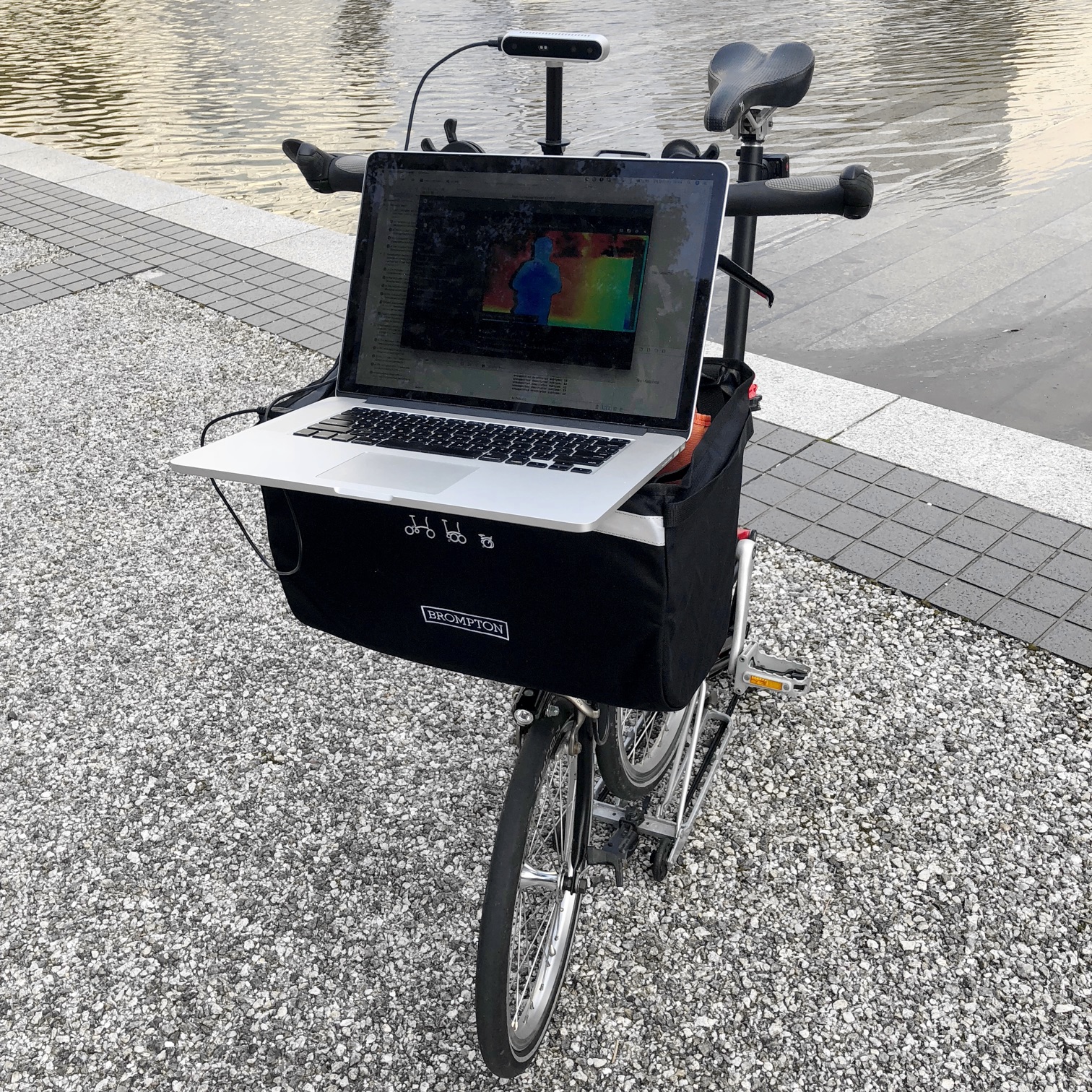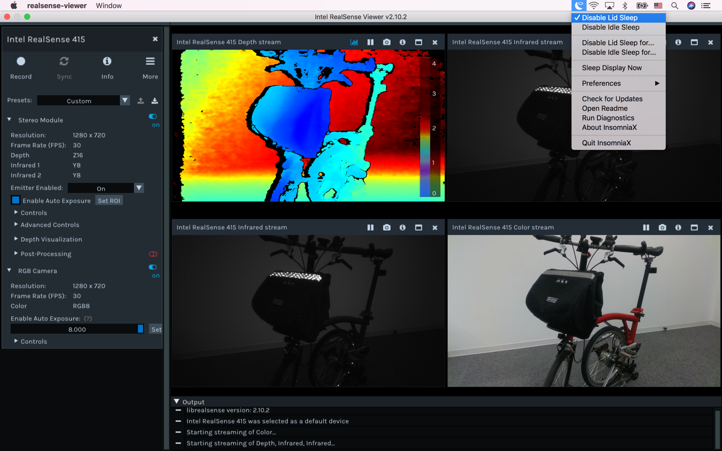 ここではRealSenseをBromptonに取り付けている。RealSenseは単体では動作せず、コンピュータを必要とするので、Bromptonのフロント・バックがピッタリという次第。もっとも、フロント・バッグに入れるためにMacBookを閉じると、スリープして処理が止まってしまう。これを避けるには、InsomniaXなるユーティリティを利用して、Disable Lid Sleepをオンにすれば良い。