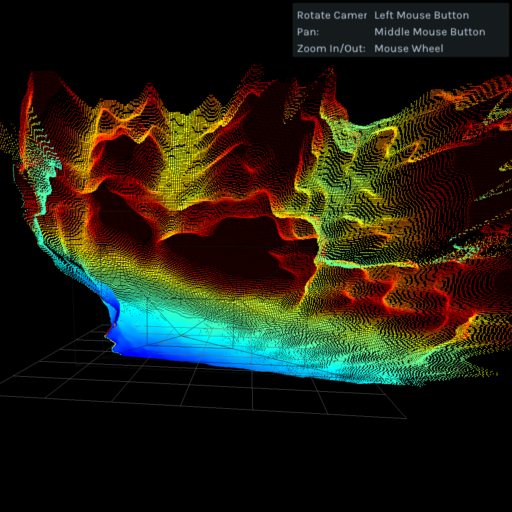 このようにしてRealSenseで深度情報を記録しながら、全周1kmほどのエリアを時速20km前後で一周した。以下のムービーでは2Dのデフォルト・プリセットによって深度をビジュアライズしている。青い部分は手前で、水色、緑、黄色、赤と色が移るにつれて、より距離が遠いことを示す。10m以上の距離は測定できないので、黒く表示される。色で距離を知覚するよう思念を凝らして見て欲しい。