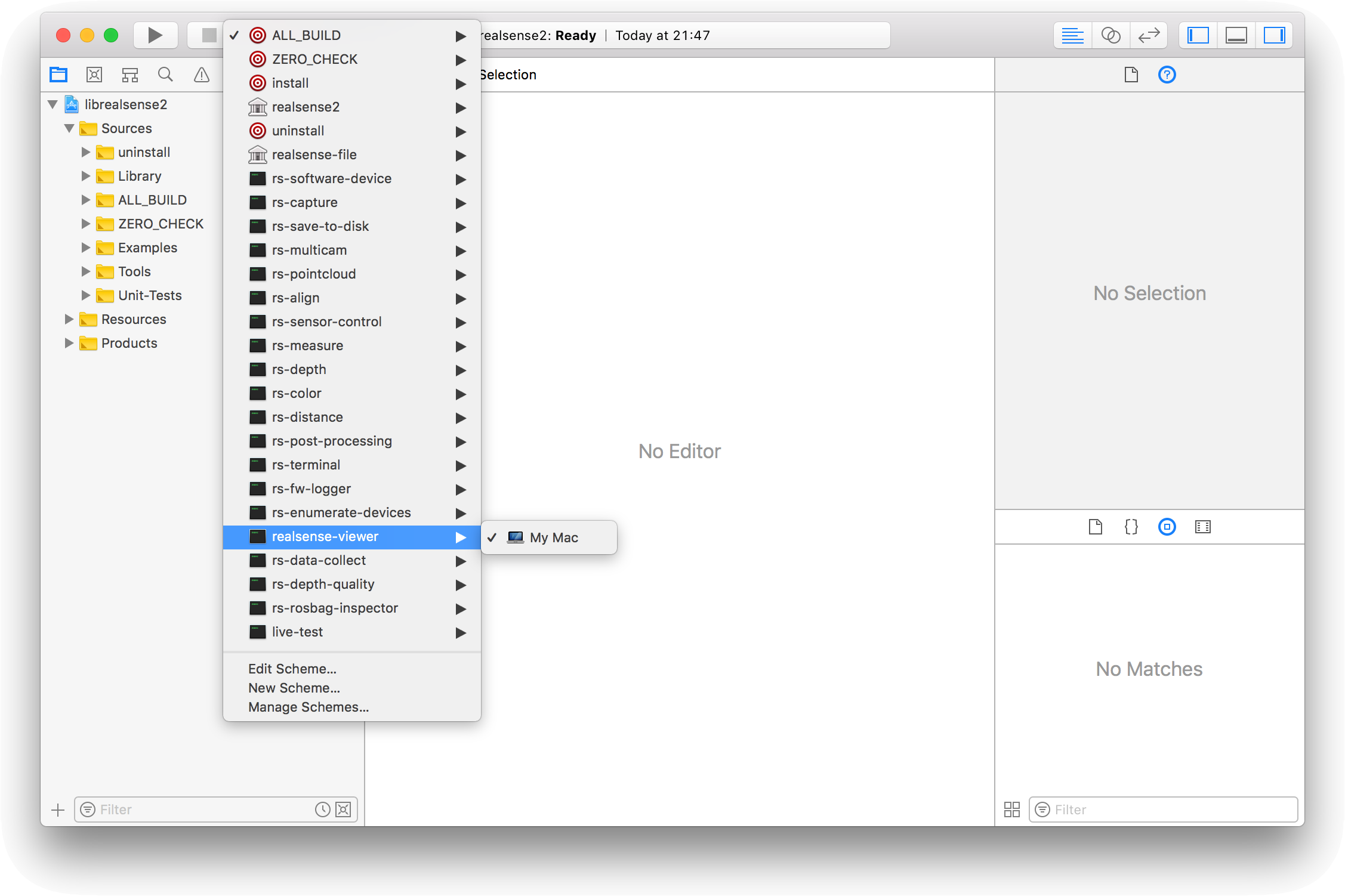 4. Xcodeのスキームで realsense-viewer を選択して実行(Run)する。
