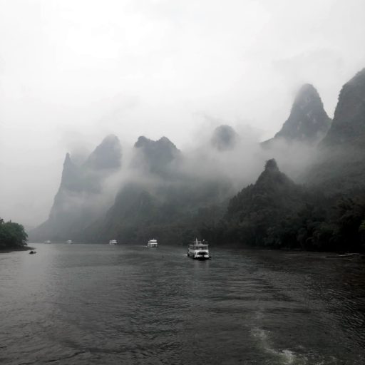 水墨画のような景色を見たいという家族のお供で桂林(Guilin)を訪ねた。定番の漓江(Li River)の川下りの船に乗り込んだところ、ちょうど小雨模様で完璧な世界が出現。石灰岩が侵食されて垂直に切り立った山々は、荒々しい岩肌と濃い緑の樹々のまだら模様。水蒸気が立ち込めて霧となり、極端な空気遠近法で濃淡が描かれる。あまり期待していなかったものの、異世界感たっぷりの絶景に心奪われる。