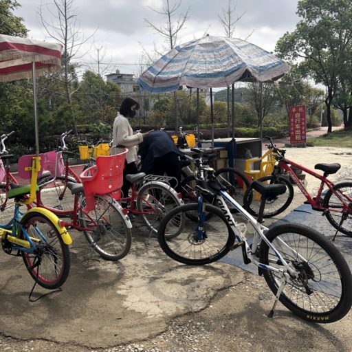 ともあれ、これは走らないわけにはいかない。待ち構えていたように、路傍には貸し自転車屋がある。レンタル料金は3時間で50人民元(約850円)。借りたマウンテン・バイクは、チェーンのオイルが切れ気味だったものの、走り出せば爽快極まりない。カルスト・タワーの山々を眺めながら、滑らかな舗装道路を走る醍醐味は格別。あろうことなら、ロード・バイクで高速ライドしたいところ。