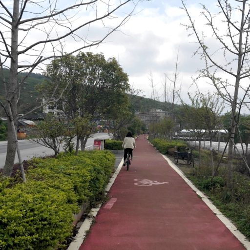 これだけなら単なる観光だが、川下りの終着地、陽朔(Yangshuo)から桂林に戻る自動車から側道を見て驚いた。自動車道路に沿って両側に、赤茶色に舗装された綺麗な小道が延々と続いているのだ。これは高品質アスファルト(透水性レジンモルタル)の自転車専用道路に違いない。まさに中国のサイクル・スーパーハイウェイだ。しかし、たまに見かける自転車はママチャリばかりで拍子抜けする。