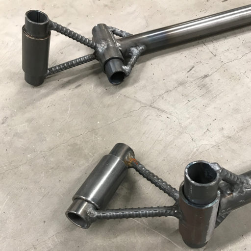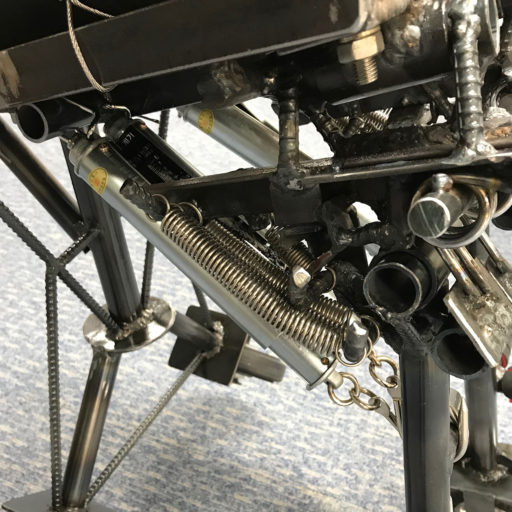 そこから実際に作って行く。まずは一番体重が掛かる胸板の部分と、後輪に続くフレームを作った。動力部は、子供用の自転車を半分に切断し、後ろ半分を使用した。この作品では、体重が掛かると胸板部分の関節が回り、体の位置が地面に向かって下がって行くのが特徴である。そうすると、うつ伏せという体勢に加え、関節が動いてしまうため、バランスの取り方が難しくなる。そうすることで、体験者が嫌でもバランスを取ることをするように誘導したかった。