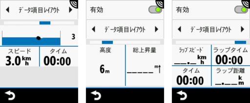 Varia Visionの側面を指でスライドすれば、表示内容か切り替わる。どのような情報を表示するかは、Edgeで設定する。何画面持つか、どのようなレイアウトを使うかも指定できる。これはEdge自体の画面設定とほぼ同じだ。数値表示が多く、グラフィカル項目が少ないのは残念。移動中の情報提示は直観的であって欲しいが、機器の性能不足か、Garminでは数値表示が多い。