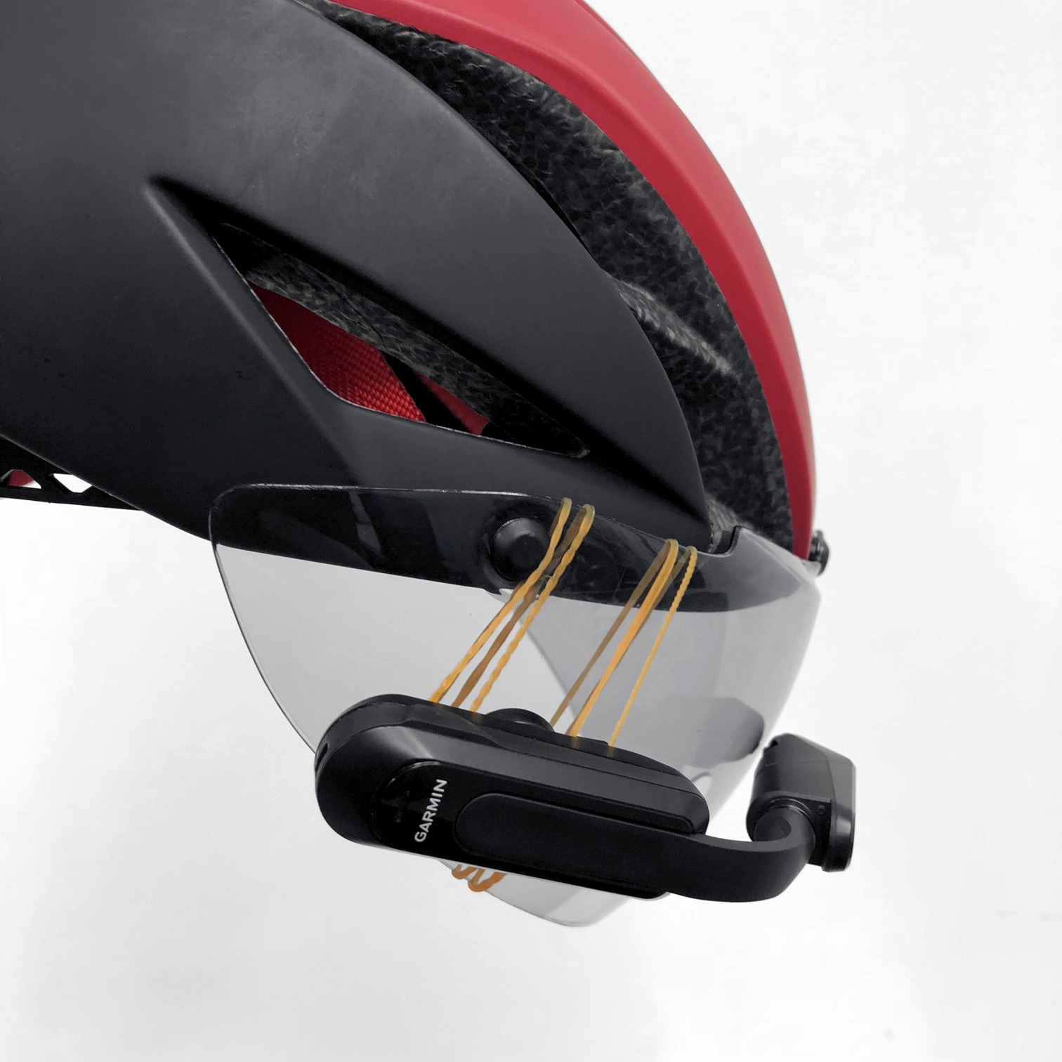 ところで、Varia Visionは様々な眼鏡に取り付けるために、アタッチメントが工夫されている。ただ、個人差や形状の違いも大きく、Raphaのサングラスでは、テンプルの折り曲げ箇所を超えて前方に取り付ける必要があった。また、筆者が常用するヘルメット・シールドには対応していない。輪ゴムで仮留めして見易い位置を探りつつ、固定方法を考えている。妙案があれば、ご教示いただきたい。