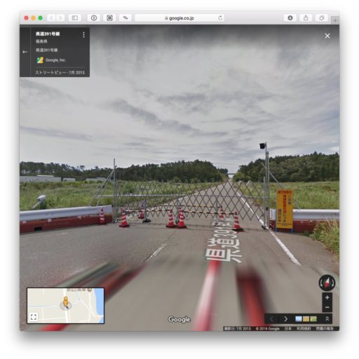 また、海岸近くの県道391号線を南下する場合は、ストリートビューでは双葉町に入って郡山海岸付近で立ち入り禁止のバリケードが出現する。警官の姿は映っていないが、たまたま不在だったのかもしれない。ここからフクイチまでは僅か3.6km。これらは通行規制情報にも一致する。つまり、警戒区域・帰還困難区域には立ち入れないわけだ。