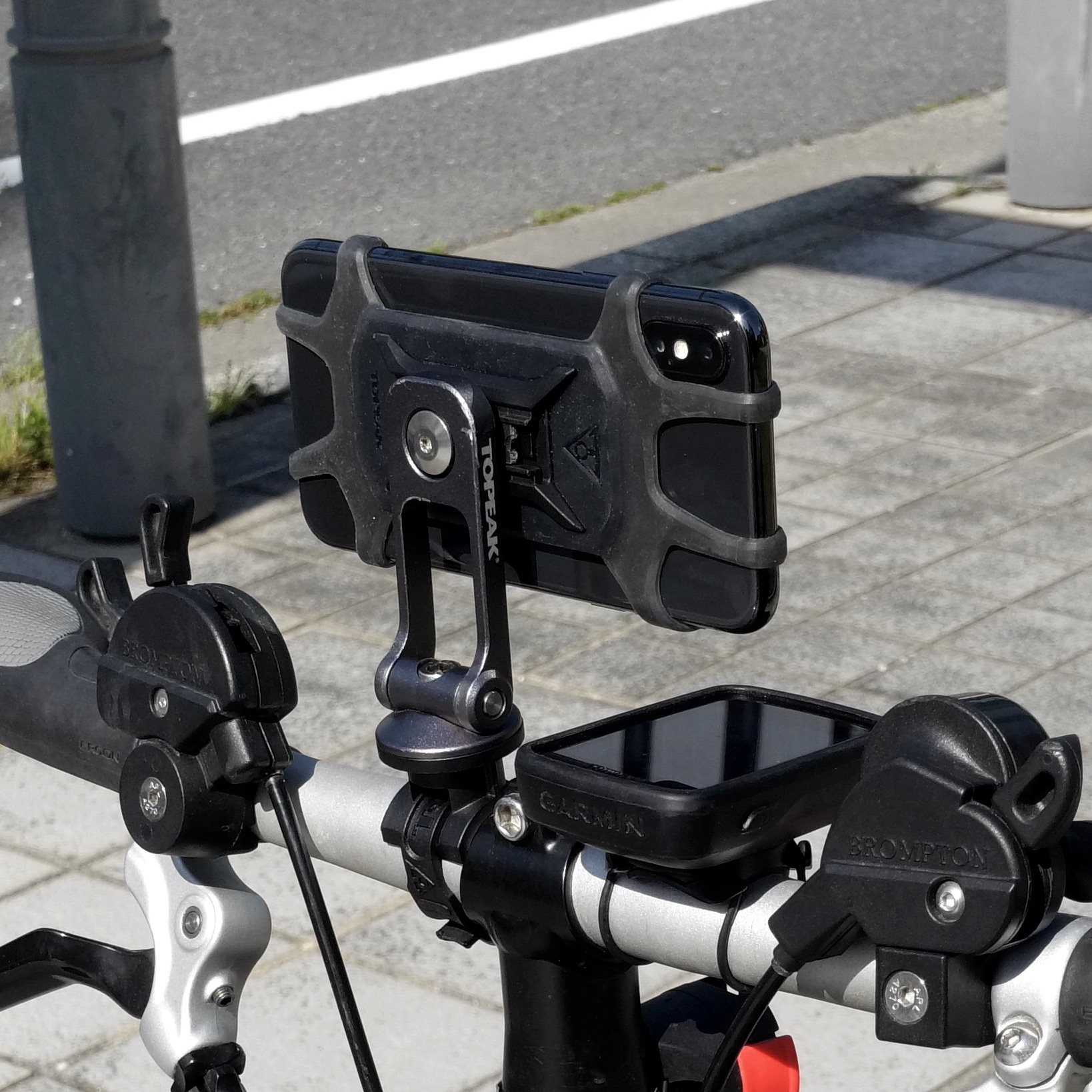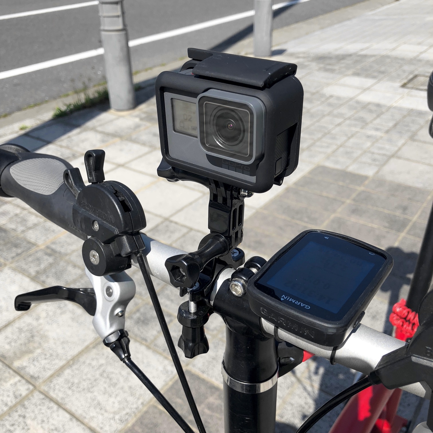そこで、前回と同じ全周約1kmのタイル敷き歩道をBromptonで走行して撮影を行った。急激な加速や回転は避けて、時速20kmを保つようにした。アクション・カメラはハンドル・バーの中央付近に取り付ける。ビデオの設定は1920×1080ピクセル、30fpsで手ブレ補正はオン。できるだけ堅固に固定したが、走行中にカメラが小刻みに震えているのが見て取れる。このような状態で撮影したビデオを見てみよう。