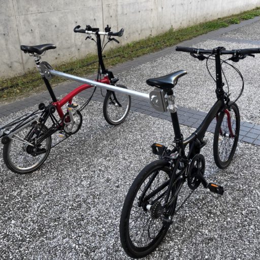 持参した自転車を、専用の連結バーを使って連結させます。どうつないだら、どんな動きをするのか、連結方法や動き方、遊び方そのものを考えていきます。