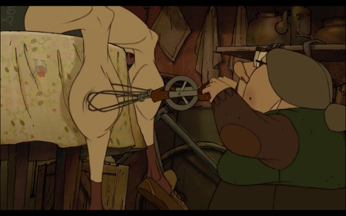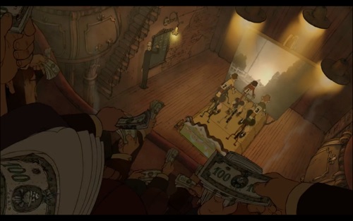 船は摩天楼がそびえ立つベルヴィルに着き、選手たちは自転車ギャンブルの駒に仕立て上げられる。それも、Zwiftの如く疾走する風景映像に向かって、点滴で栄養補給しながらペダルを漕ぎ続ける。一方、お婆ちゃんはボーカル・グループであった老婆3人と出会い、彼女たちの協力を得て青年を救い出そうとする。危機一髪の波乱万丈のシーンが続く中、青年たちは一心不乱にペダルを漕ぎ続ける。