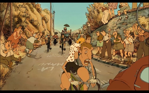 晴れやかなファンファーレが鳴ると、ツール・ド・フランス山岳ステージの開幕。沿道で応援する人々の賑やかなお祭り騒ぎ。対照的に息も絶え絶えに山道を登っていく選手たち。ところが、お婆ちゃんが乗るサポート・カーを出し抜いて、ギャングがリタイヤした選手をさらっていく。青年も拉致されたことに気づいたお婆ちゃんは、ギャングが乗り込んだ大型汽船を足漕ぎボードで追いかける。