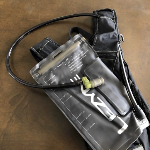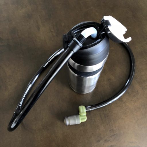 このボトルは容量が小さいものの、ハイドレーションの常時少量給水なら、通常のボトルほど大量に水を飲まずに済む。チューブの先端はマグネット・クリップを使って襟元で着脱できるようにする。ただし、チューブの取り回しが難点で、自転車に乗り降りに一手間あり、誤って後輪に絡まる危惧もある。マウンテン・バイクでの水分補給は、まだまだ研究が必要だ。
