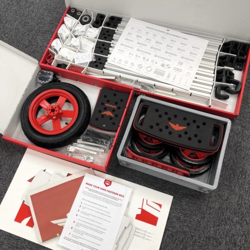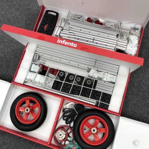 このようにして届いたInfentoは、数個の箱に白いアルミのパイプに黒いタイヤや赤い車輪などの部品が、ぎっしりと詰まっている。アルマイト加工の滑らかな感触や、接合部や可動部の機構を確かめるのは楽しい。ただ、輸送時の振動のせいか、段ボール製の仕切りの一部が型崩れしていたのは残念。ここはキット・マニアの心をくすぐるためにも、強化プラスティックなどで頑丈に作って欲しかった。