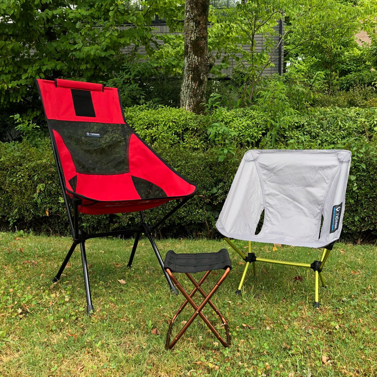 筆者がお気に入りは、何と言ってもHelinoxの赤いサンセット・チェア。ハイバックに身体を預けて微睡めるのが素晴らしい。やや大振りで重量は1.5kgほどあるが、頑丈で安心感がある。出来るだけ軽くしたい場合は、0.6kgのチェア・ゼロ。これは腰掛けてスケッチや読書をするのに最適。メーカー不明の小さなスツールはミニマムな腰掛けであり、他のチェアと組み合わせて足置きとしても使える。