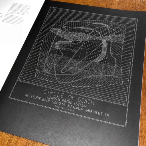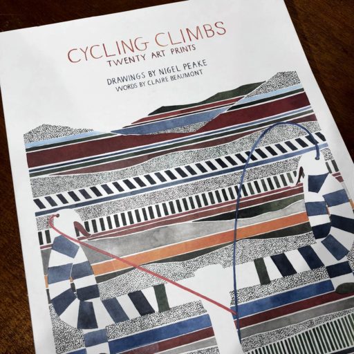 北アイルランド出身の画家ナイジェル・ピーク(Nigel Peake)の画集「Cycling Climbs」は、その名の通り、サイクリングでの登坂、すなわちヒルクライムを題材とした20枚の絵画で構成されている。これらは大判厚手の上質紙に印刷されており、弱い糊の無線綴じなので、それぞれを切り離して額装することもできる。つまり、これは20ページの書籍ではなく、副題が示すように20枚のアート・プリントだ。