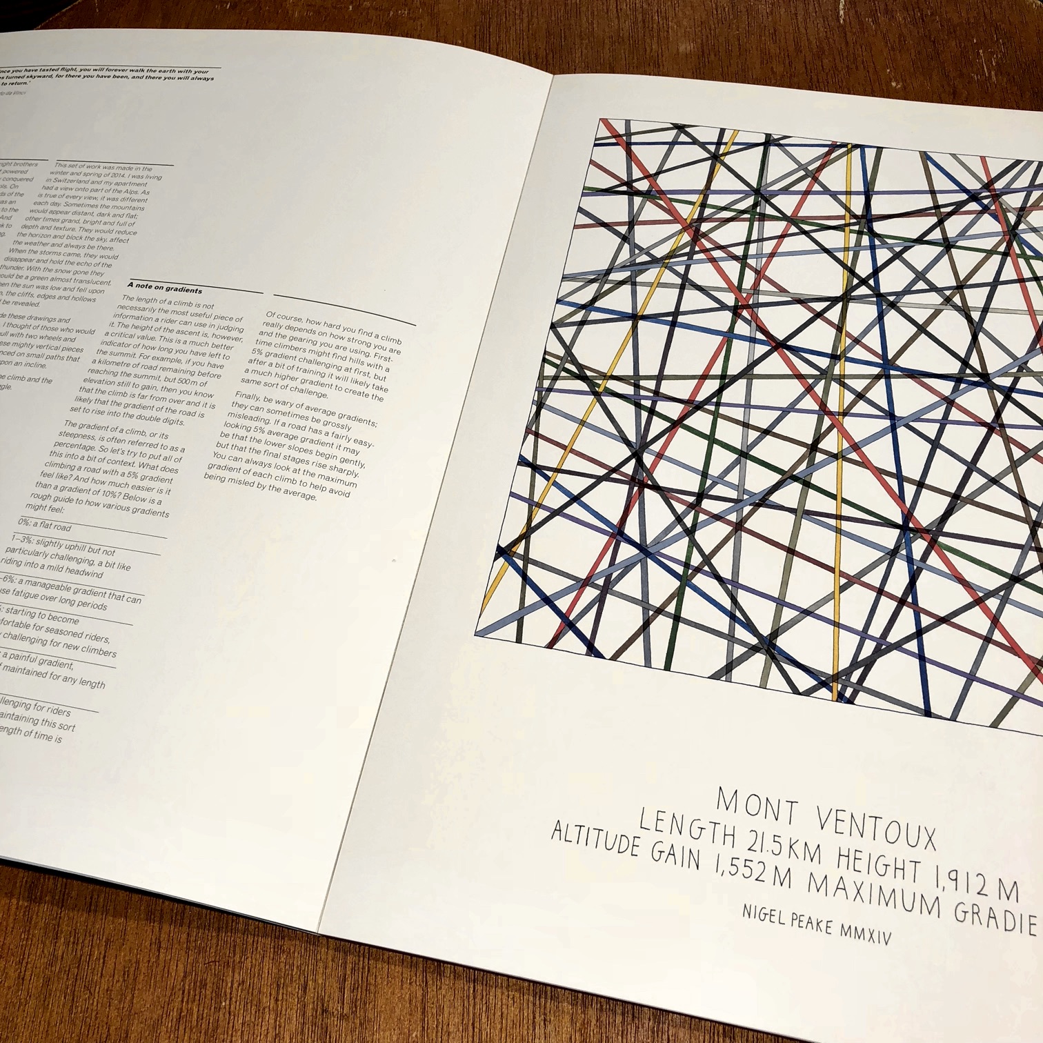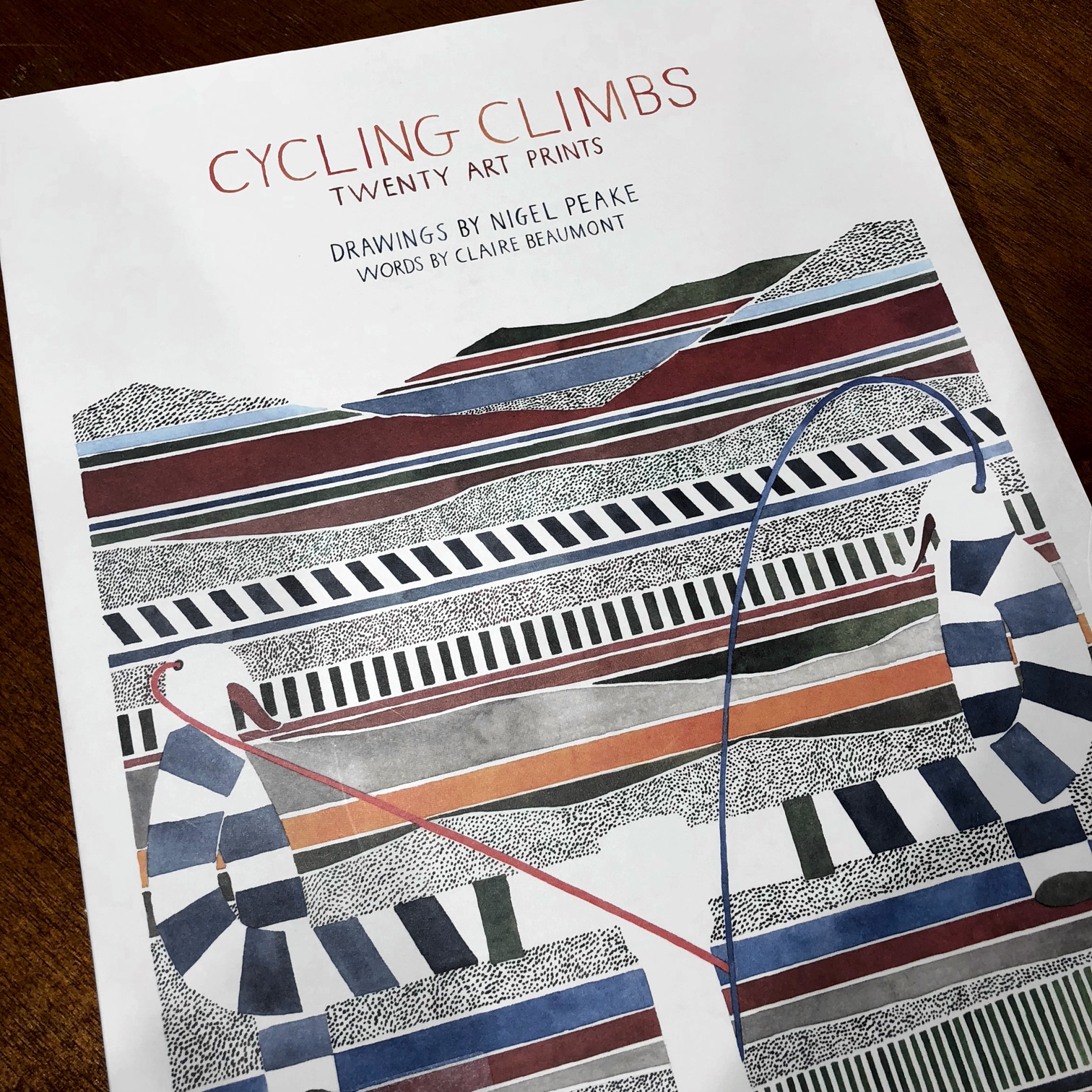 北アイルランド出身の画家ナイジェル・ピーク(Nigel Peake)の画集「Cycling Climbs」は、その名の通り、サイクリングでの登坂、すなわちヒルクライムを題材とした20枚の絵画で構成されている。これらは大判厚手の上質紙に印刷されており、弱い糊の無線綴じなので、それぞれを切り離して額装することもできる。つまり、これは20ページの書籍ではなく、副題が示すように20枚のアート・プリントだ。