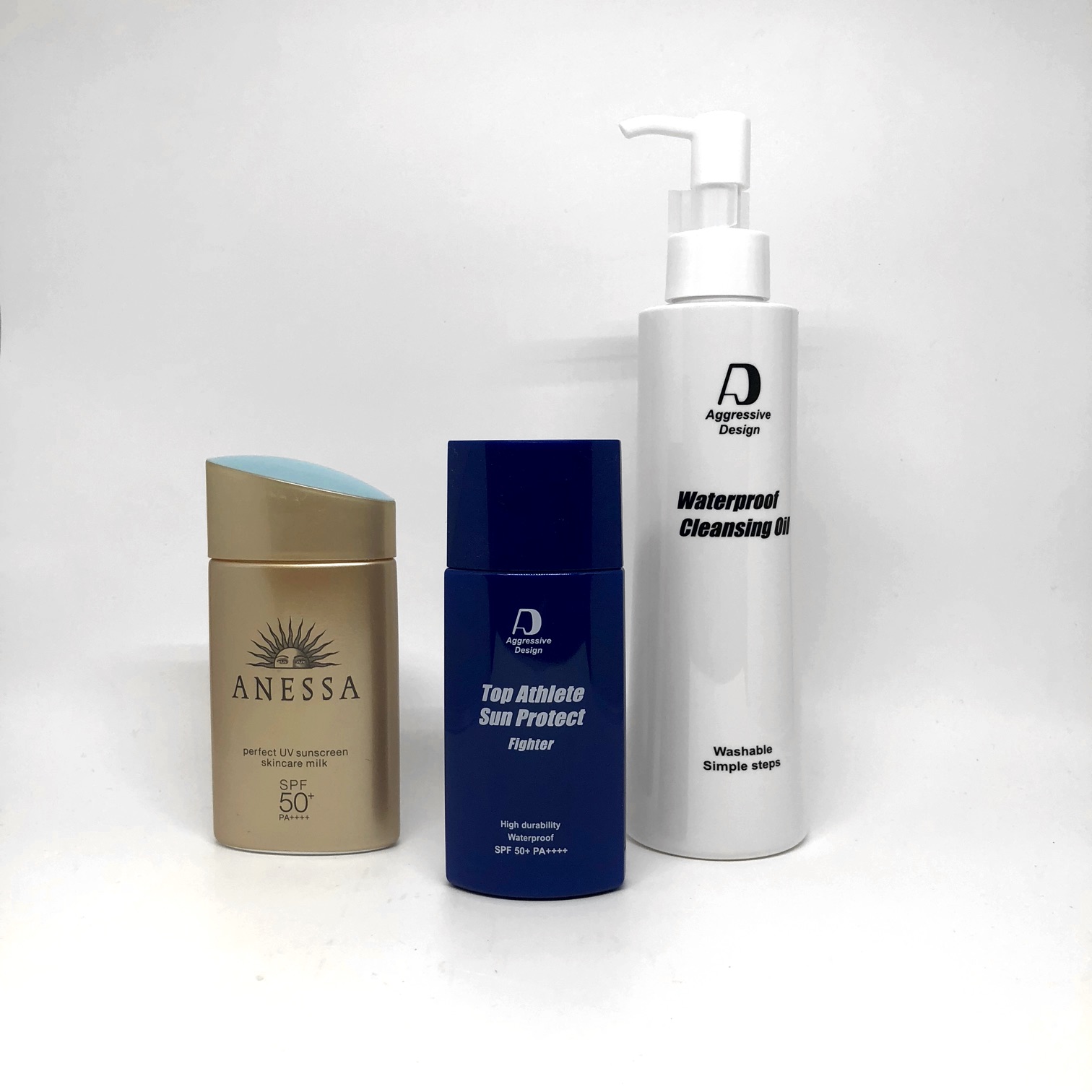 飲み物や食べ物に加えて、夏は強烈な日差しから肌を守る必要がある。そこで衣服では防げない顔や首に日焼け止めクリームを塗る。その定番は資生堂のANESSAで、たっぷり塗っても不快感がない。ただし、この手のクリームは、次第に汗で流れ落ちる。そこで、耐汗性能を高めたのがAggressive DesignのFighter。潤滑剤などで有名な和光ケミカルの製品で、専用クレンザーが用意されるほどの強力さだ。