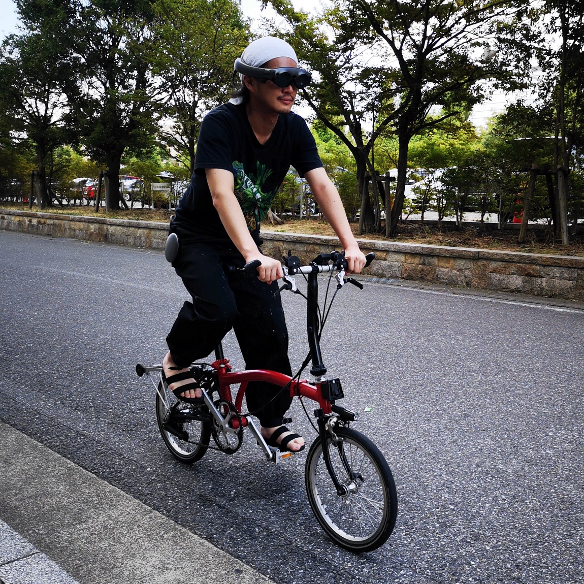 Magic Leap Oneを装着して自転車に乗ることも可能。明るい屋外でもHoloLensほど視認性が悪くならない。映像は半透明っぽく見えて、視界を遮らないのは好都合。装着感も良好で、比較的小さく軽いので負担は少ない。ただし、周辺視野が狭いゴーグル型なので、左右確認など安全面では不安が残る。また、コントローラや空間認識は確かめられていないので、Magic Leap One本来の評価はできない。