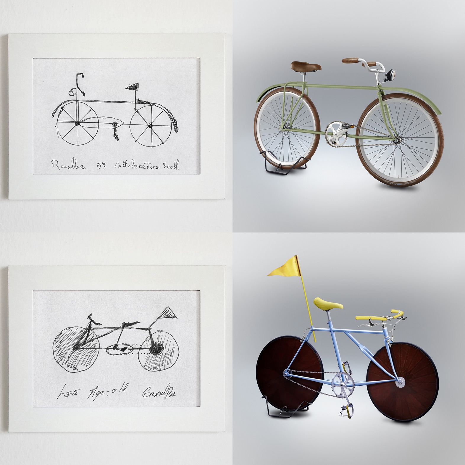 このプロジェクトの種明かしをすると次のようになる。まず、知人に男性用自転車をスケッチとして描いてもらう。これは実際の自転車を見ることなく、記憶だけを頼りに描く。次に、このようなスケッチから、興味深い自転車を可能な限り忠実に、リアルに見えるように丹念に描く。いずれもコンピュータを使ったベクター・グラフィックスで、3Dモデリングではないようだ。