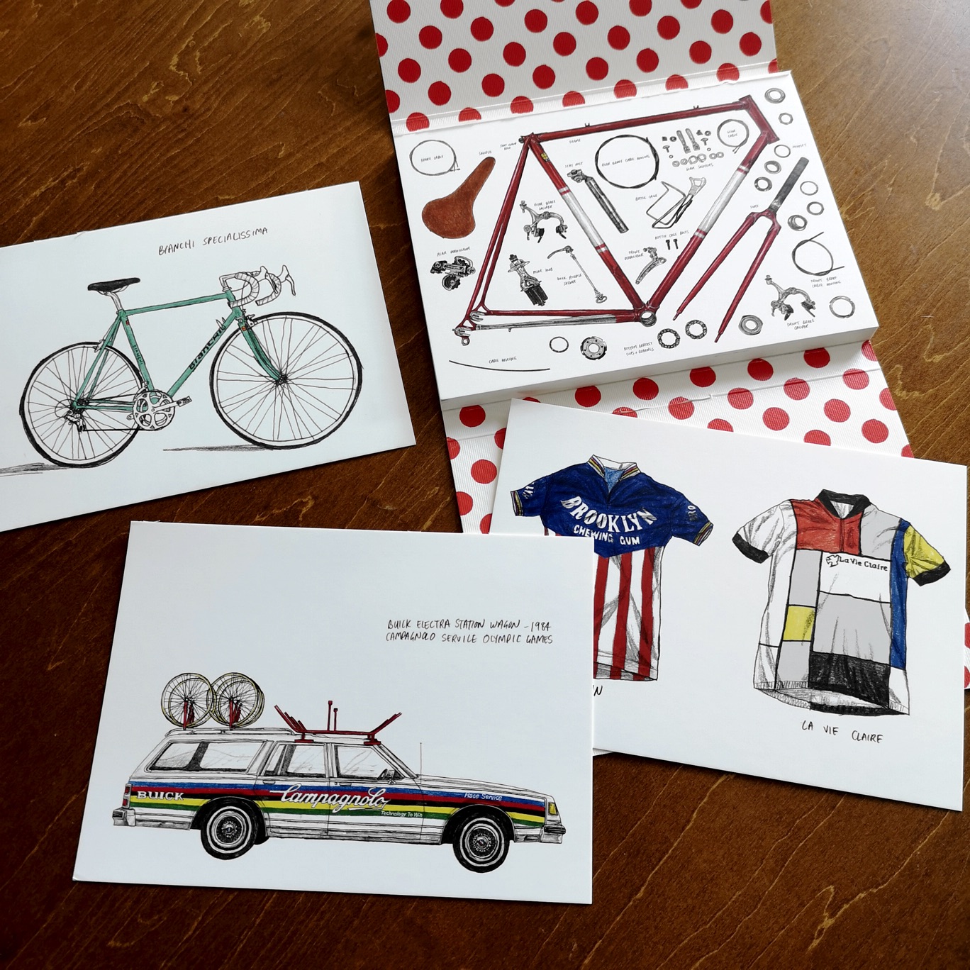Anatomy of Cycling」は自転車塗り絵絵本なども出版しているLaurence King社刊行の自転車ポストカード22枚組。デヴィッド・スパーショット(David Sparshott )によるロード・レースに関連した素朴なイラストは味わい深く、裏面に添えられた短い説明は豆知識になりそう。ロード・バイク、フレーム、コンポーネント、サポート・カー、ジャージなど、歴史的な逸品から近年の話題作まで楽しめる。
