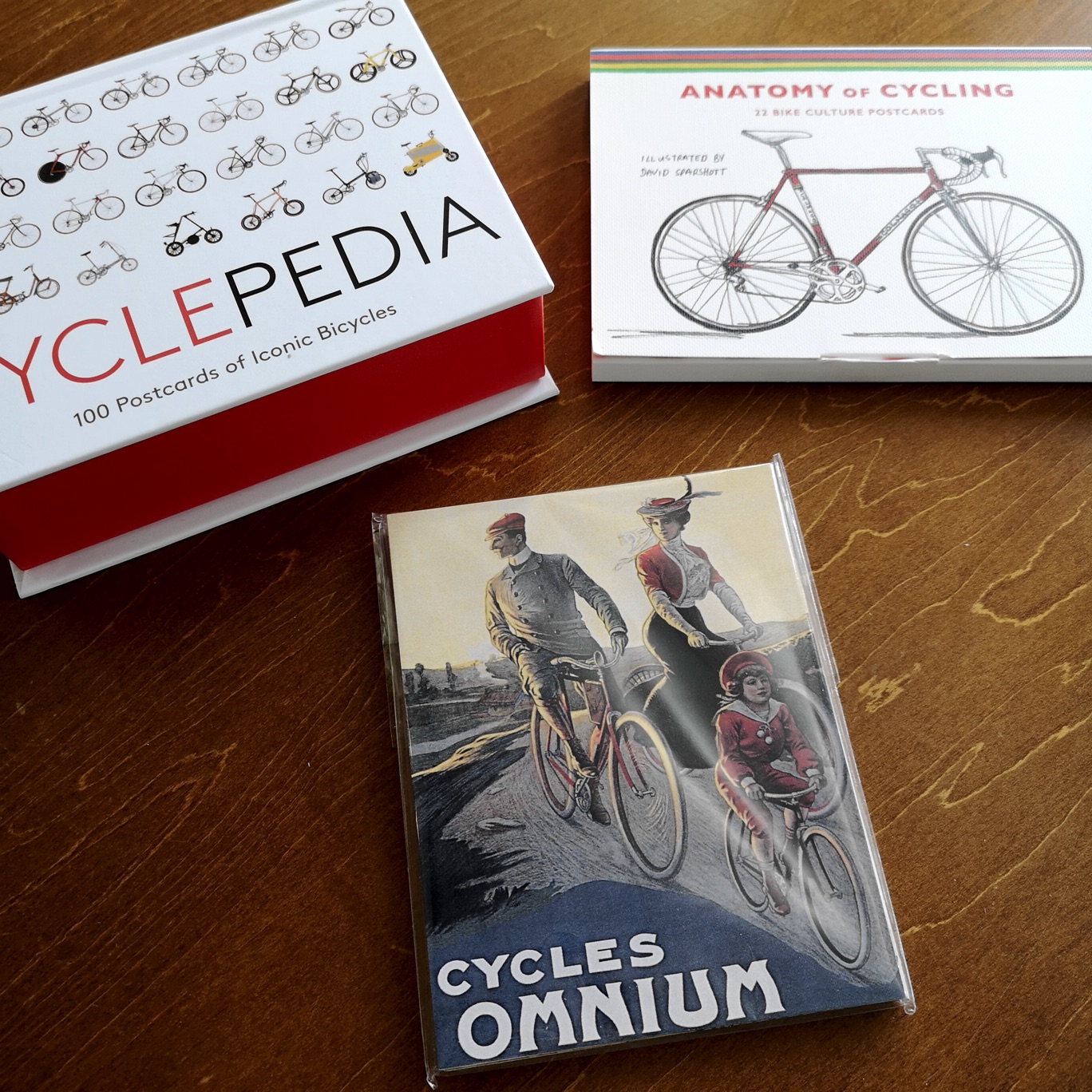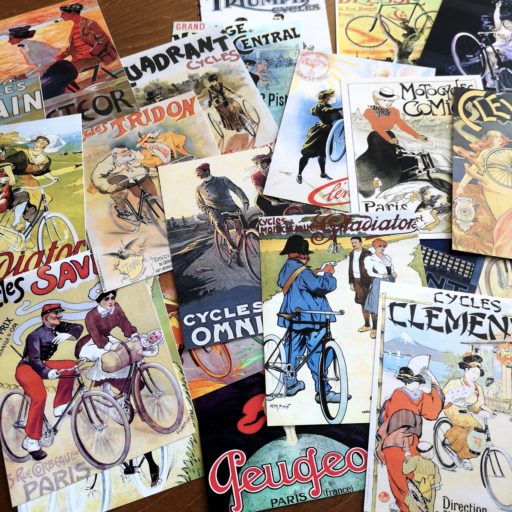 アンティーク絵画によるグッズを数多く扱うPixiluvは、24枚組の自転車のポストカード・セットも販売している。これはアール・デコ調の広告絵画で、ほぼすべての自転車がセーフティ型で、唯一の例外としてロングスカートの女性が乗る三輪型がある。時代がかった紳士淑女の服装や、髪結い着物姿の日本趣味など自転車を通した世俗が興味深い。ただ、説明や詳細な情報が添えられてないのは残念。