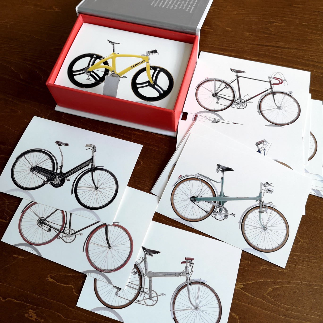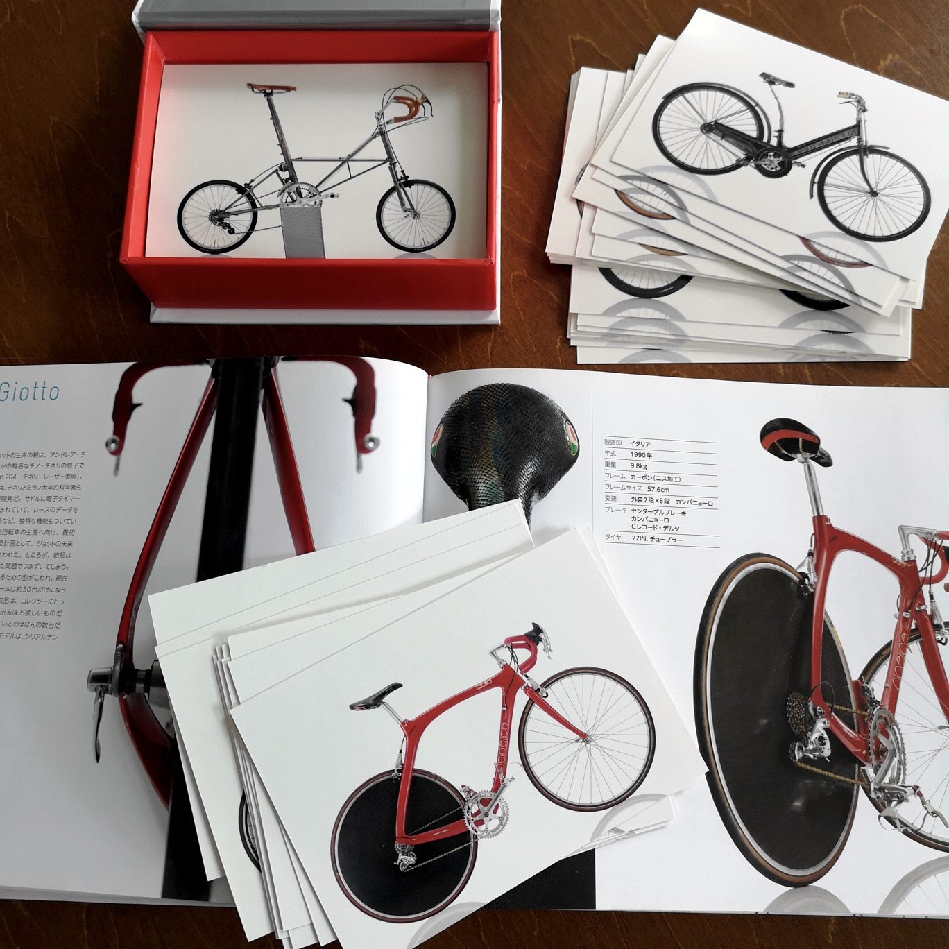 立派な化粧箱に入った「Cyclepedia: 100 Postcards of Iconic Bicycles」は、タイトル通り著名な100台の自転車がポストカードとして収められている。それぞれ表面は自転車の端正な右向き車体写真、裏面には名称や年式、重量、パーツなどの簡単なスペックが添えられている。ちょっとした遊びとして、カードをシャッフルして1枚ずつ取り出して、名前クイズやウンチク合戦ができそうだ。