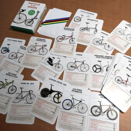 BromptonからMcLaren Venge、はたまたStridaやロンドンのシェアリング自転車など30種類の多彩な自転車を戦わせて遊ぶカード・ゲーム。実用性や速度、価格など6項目のポイントで争う。じっくり戦略を練る必要はなく、半ば自動的にテンポ良くゲームが進む。その過程で、それぞれの自転車の特徴や適性が把握できるようになっている。カード下部のコメントも理解に役立つ。何人ででもプレイ可能。