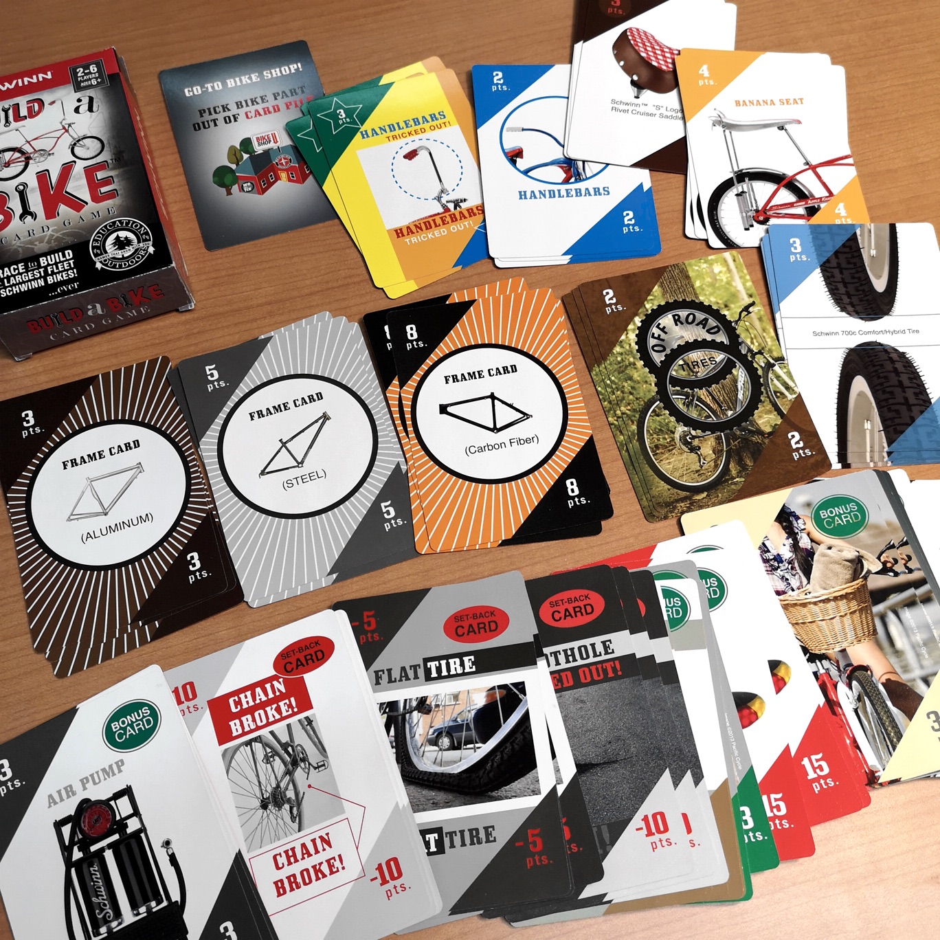 アメリカの自転車メーカー、シュウィン(Schwinn)が作ったカード・ゲーム。タイヤ、フレーム、シート、ハンドルバー、ヘルメットのカードを集めて自転車を組み立てて得点を競う。アクセサリーなどのボーナス得点もあれば、アクシデントによる減点もある。先のゲームよりルールは複雑で、戦略と推測が必要。それだけにゲーム性は高く、熱中できそうだ。プレーヤは2から6人まで、対象は6歳以上。