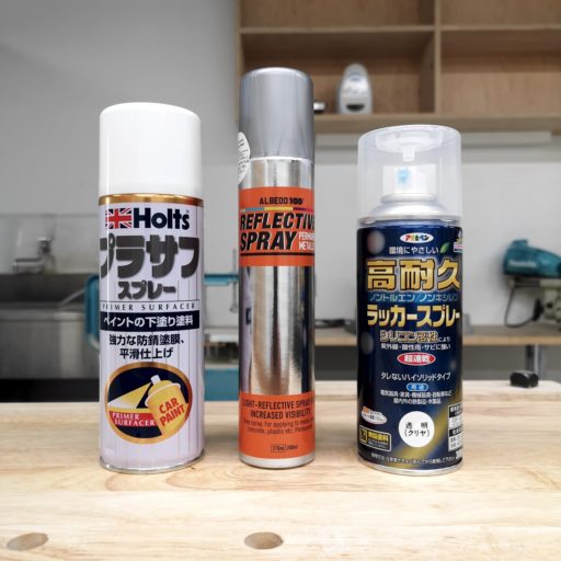 次に、フォークとフレームを400番程度の粗い紙ヤスリで擦って錆を取る。鈍い金属光沢も悪くないので、透明ラッカーで保護するだけでも良さそうだ。ただ、今回は再帰性反射塗料のアルベド(Albedo)100を使うことにした。自動車のライトを受けて、自転車が鮮明に浮かび上がるはず。セオリー通りに下地を作ってから塗装し、その後に透明ラッカーで仕上げる。都合3種類のスプレーを使うことになる。