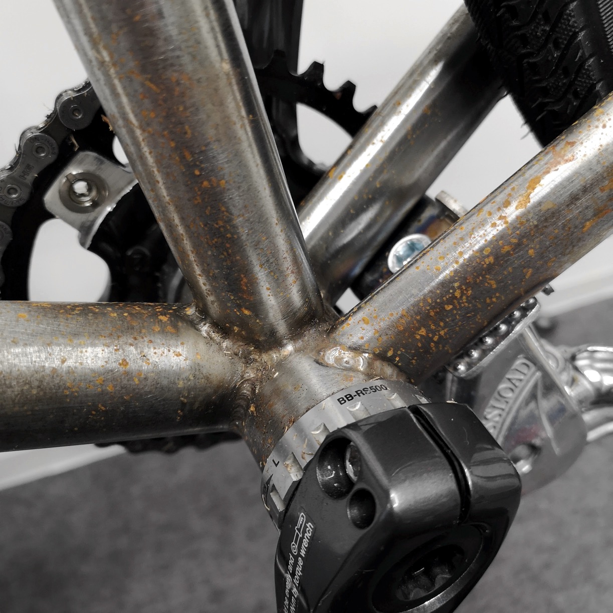 先日完成した「逆さま自転車」は無垢のクロモリ素材のままであったので、再帰性反射素材で塗装した。未塗装のまま小雨の中で使うと、翌日には錆が浮かんできたからだ。錆は紙ヤスリで取り除けるが、きちんと塗装するに越したことはない。筆者は自転車を塗装したことも、塗装のために必要となる自転車の分解もしたこともない。そこでこれは良い機会とポジティブ思考で素人作業に取り組むにした。