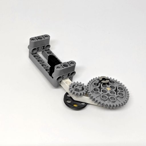 エラーを引き起こすか否かはともかくとして、急激な速度変化の影響を避けるためにも、実走に近いセンシングを行うほうが良いだろう。そこで、既に実績のある車輪の回転を減速して検出する方法を試してみる。ただし、いきなりモデリングして3Dプリントする技量はない。そこでプロトタイピングの定番レゴを使う。マインドストームと拡張セットにはプーリーや歯車が揃っているので、お誂え向き。